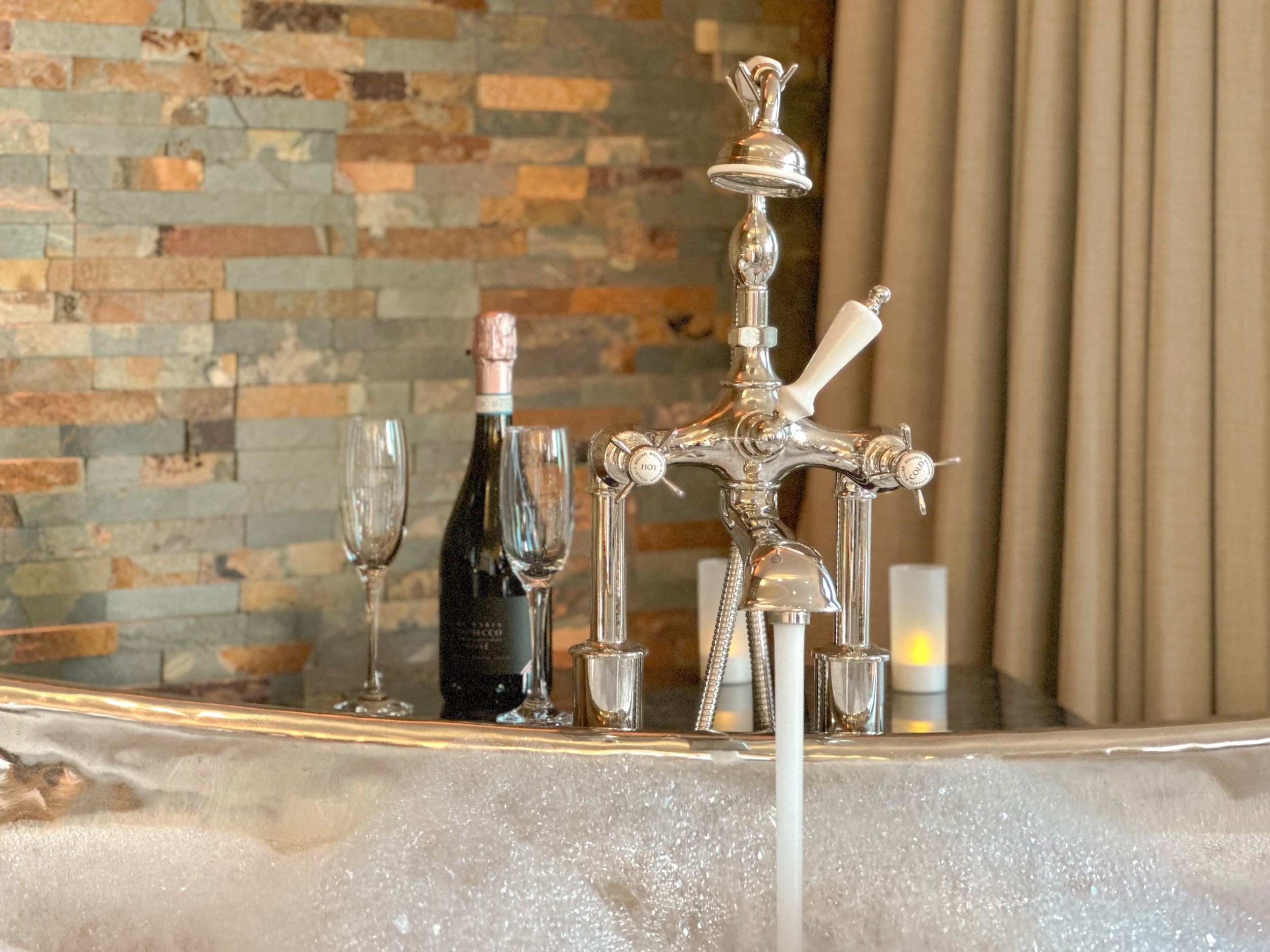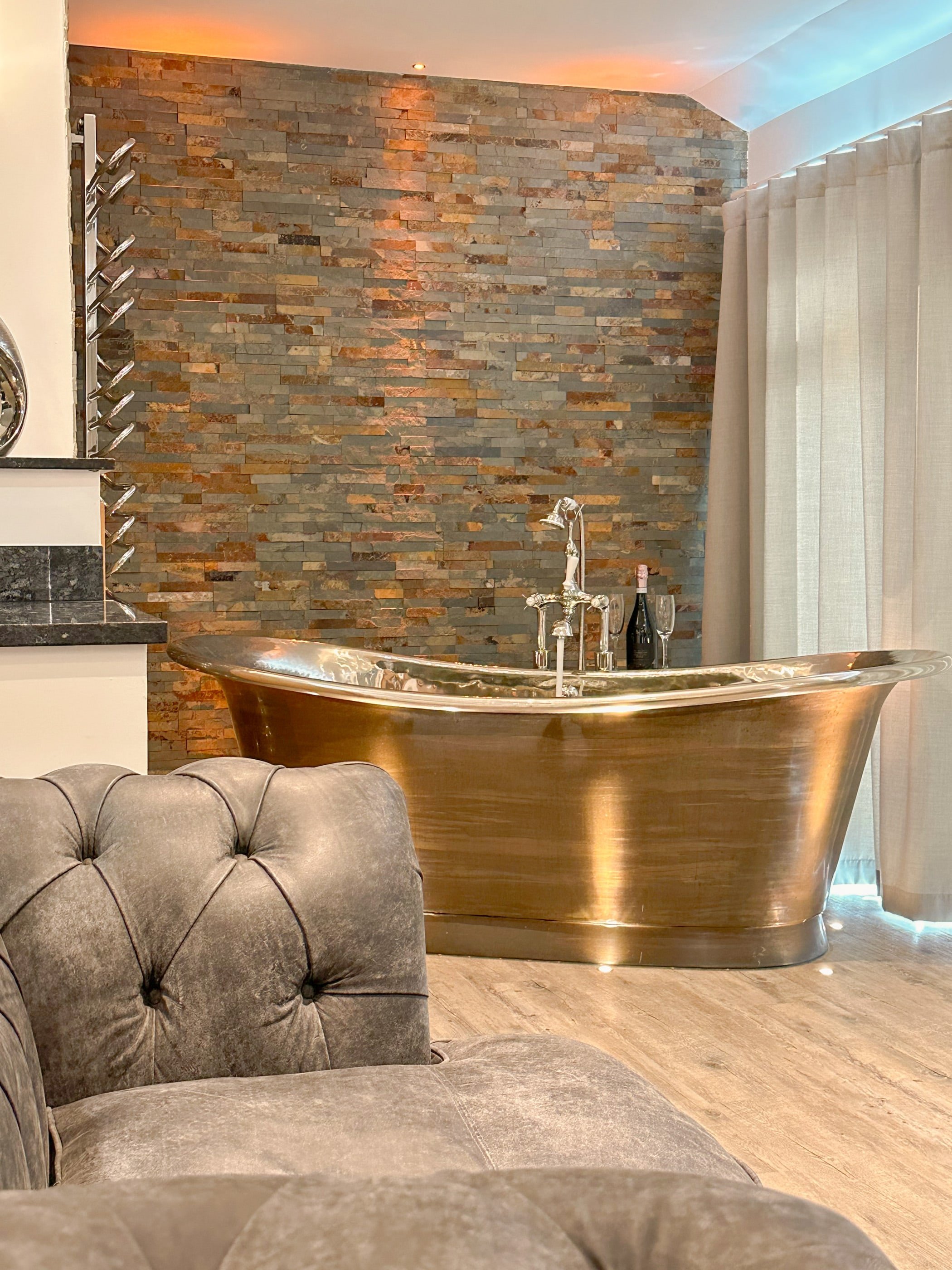 Open plan apartment featuring a brushed patina copper air-spa bath with a glistening nickel interior, perfect for couples to share.