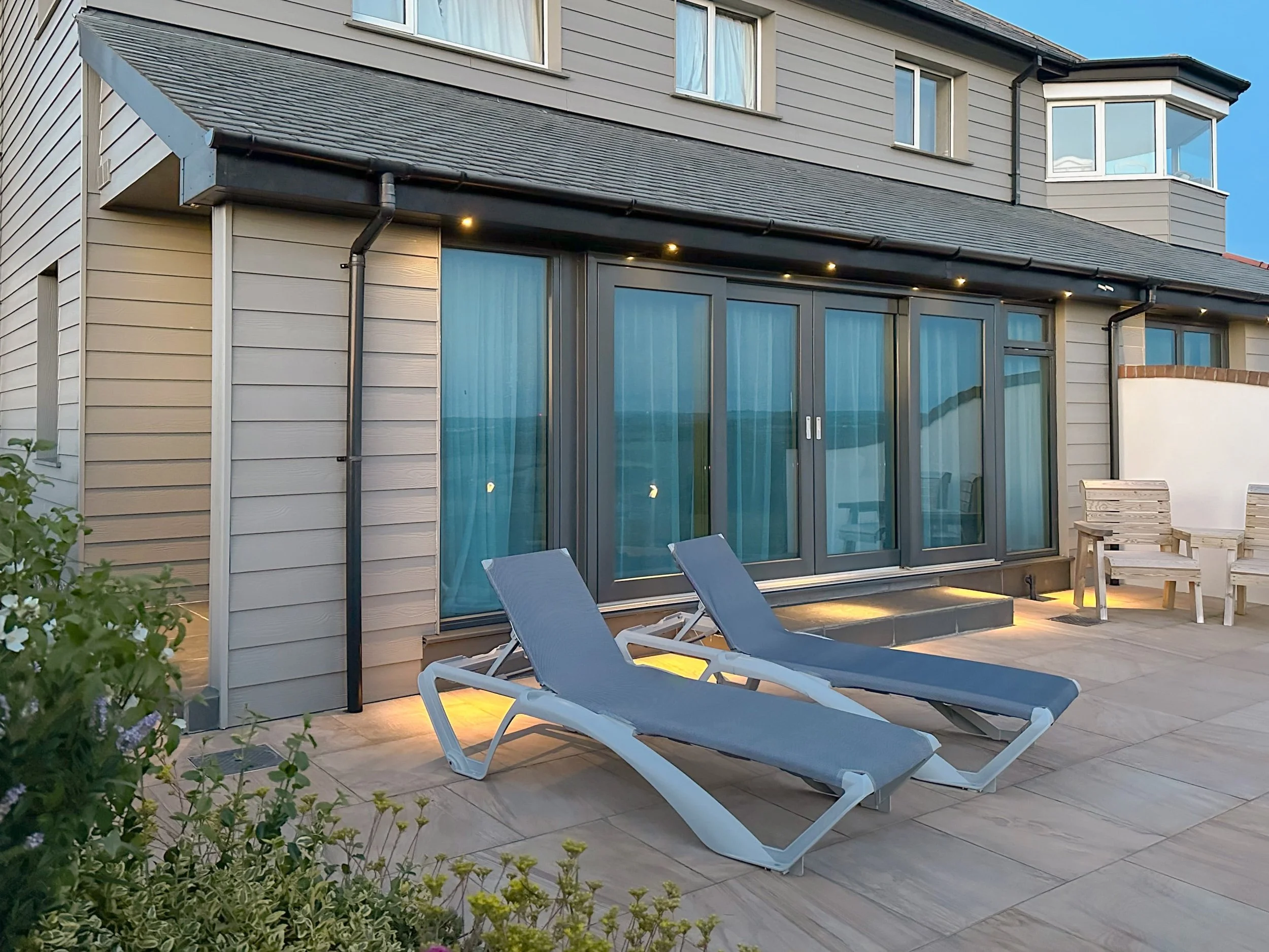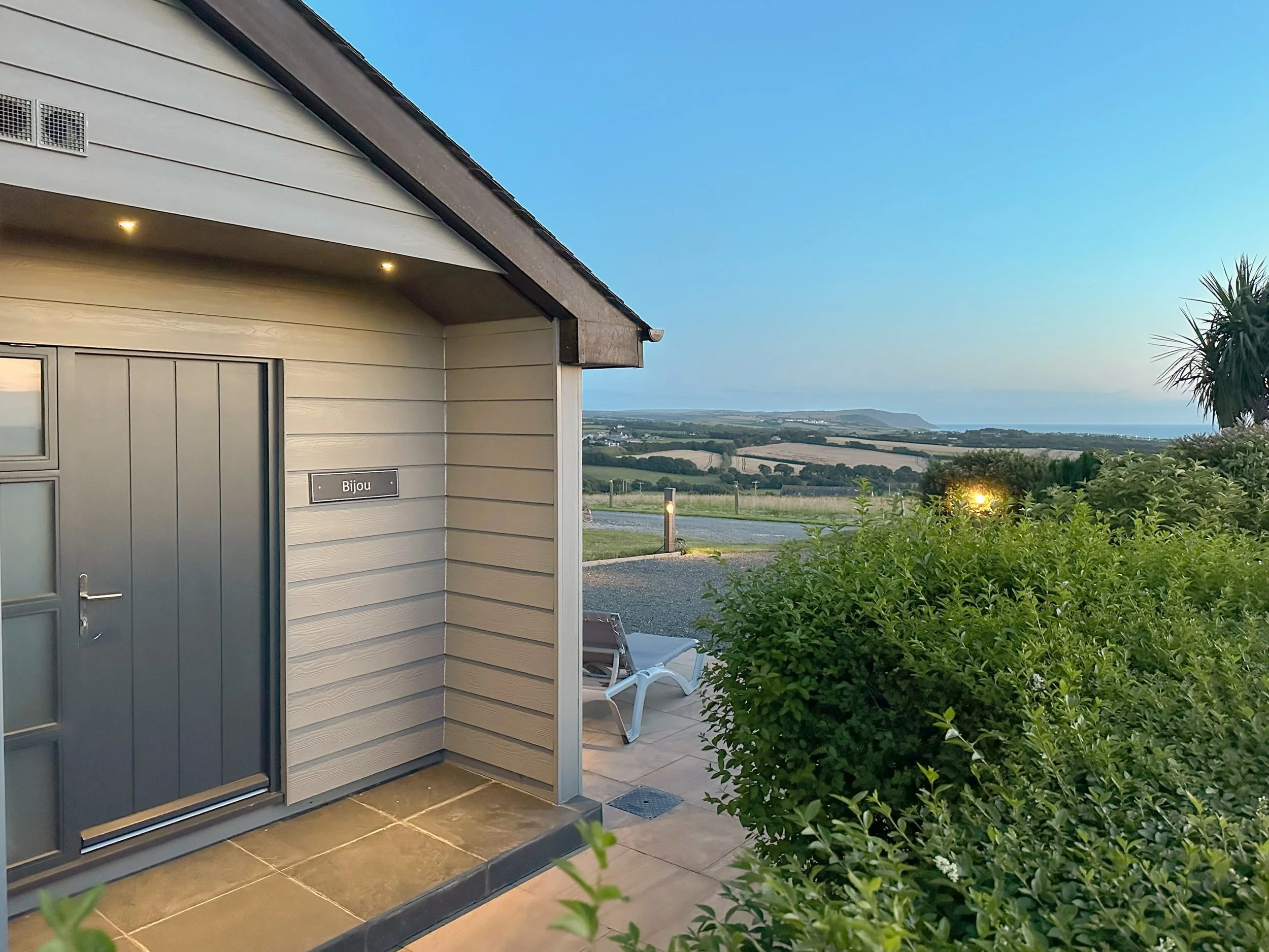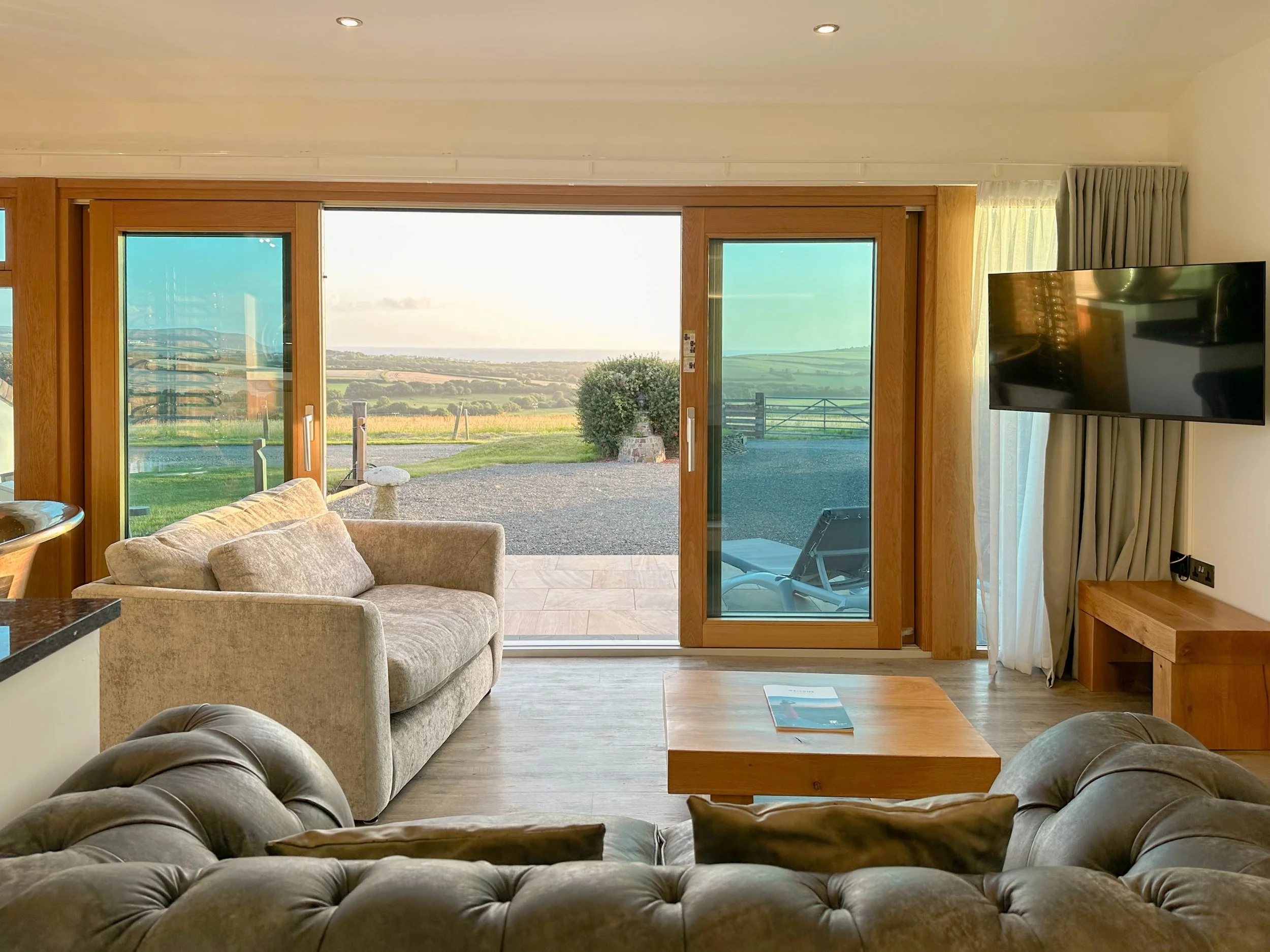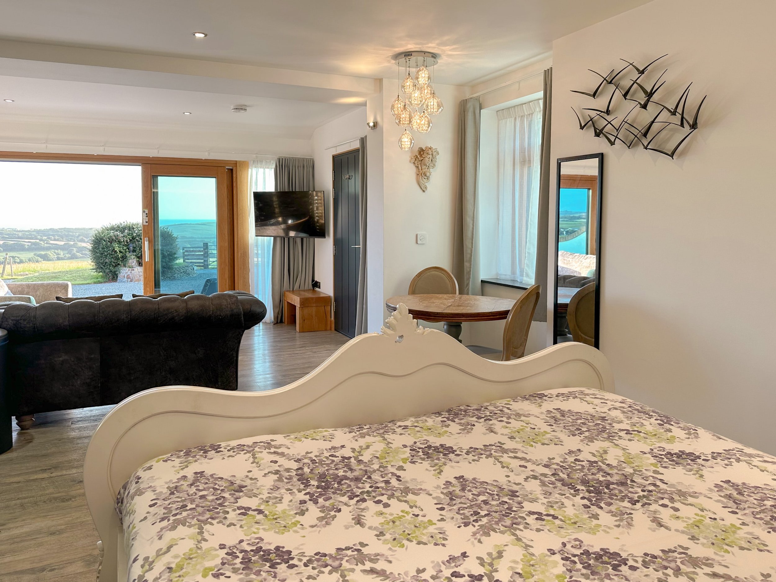 The sliding doors open to the patio area with countryside and sea views. Views towards the town of Bude can also be admired from the entrance door.