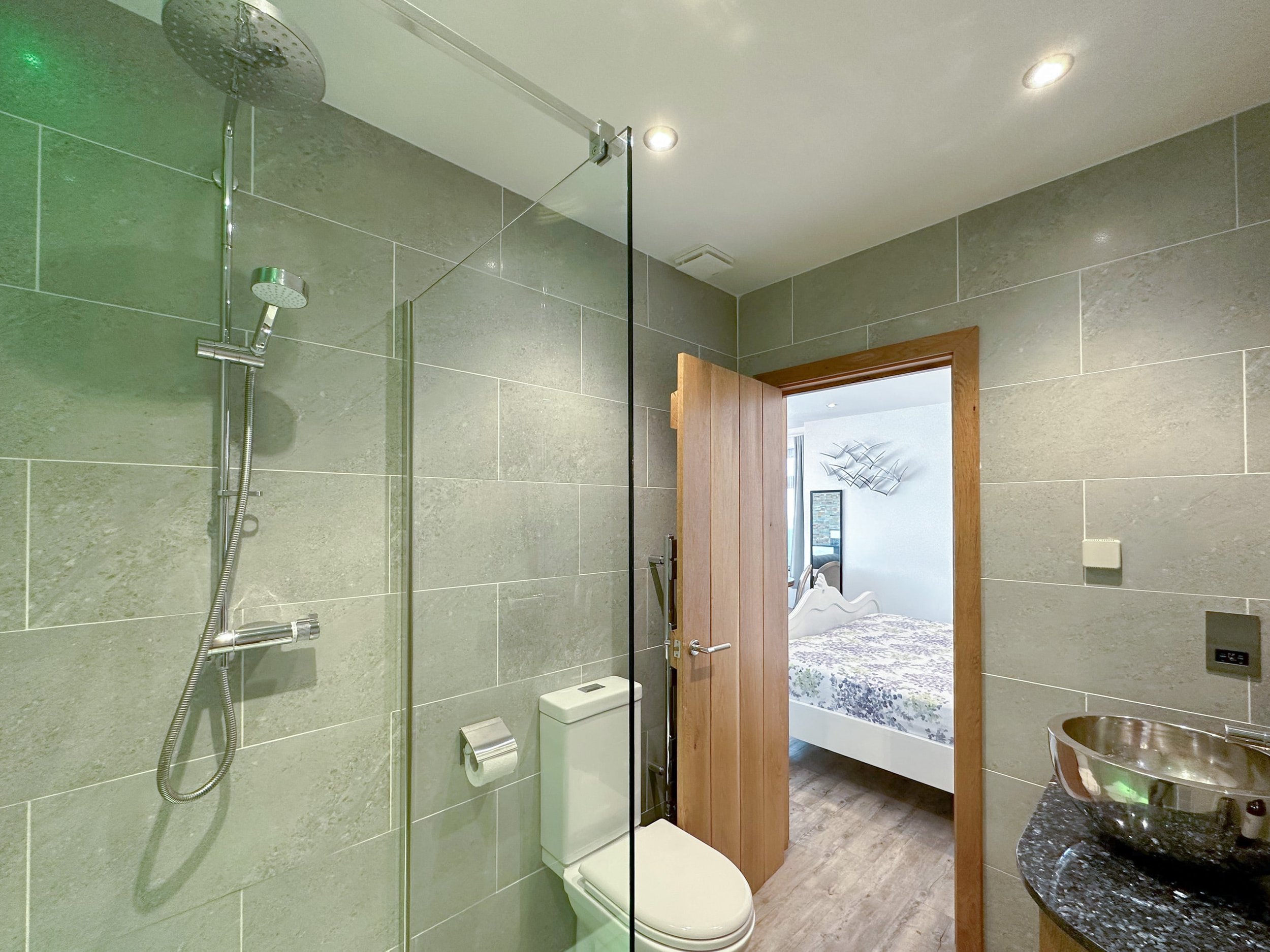The en-suite shower room features a large, walk in, rainfall shower, LED mirror lighting and hand basin with nickel interior.