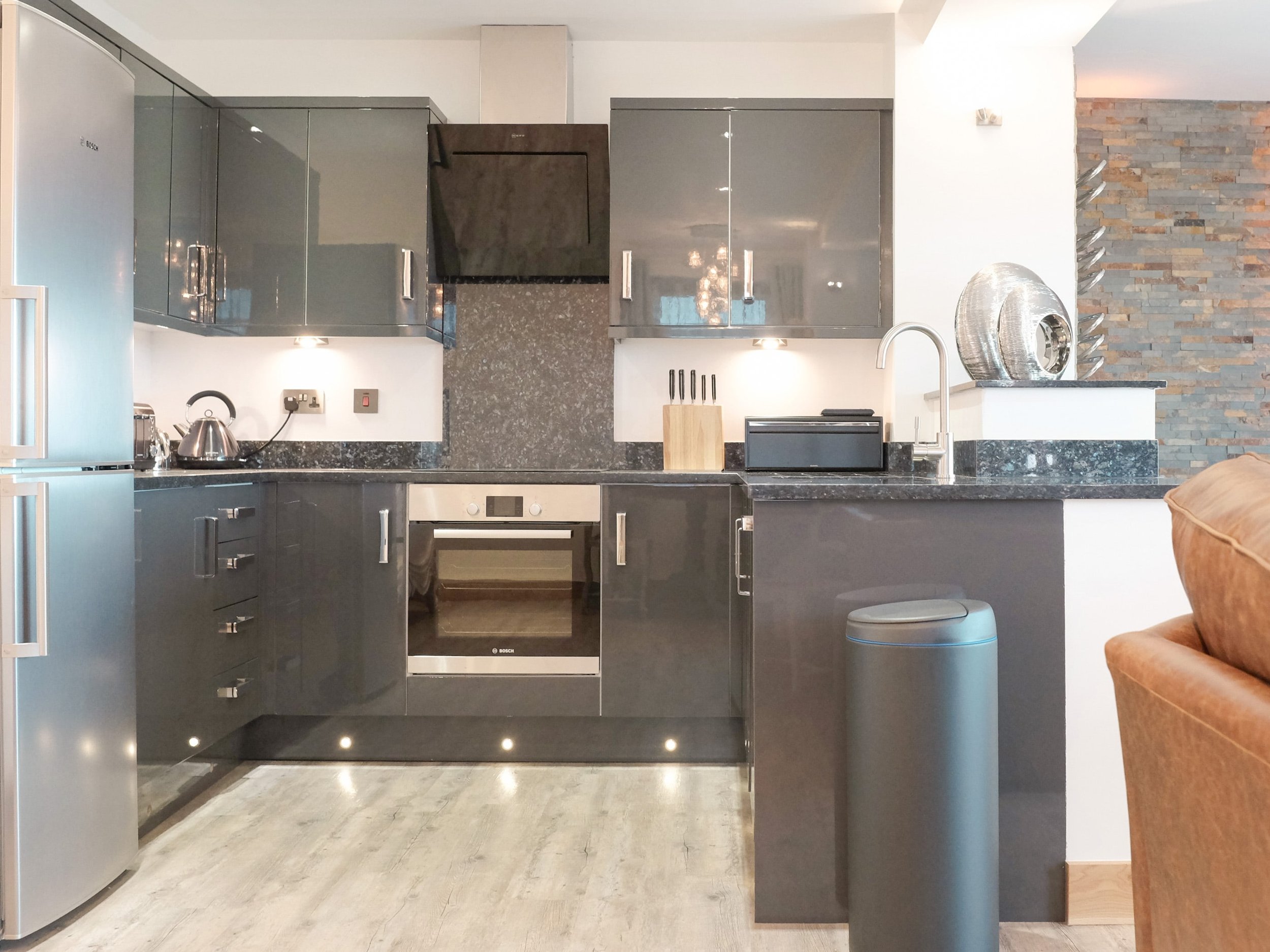 In the centre of the room, the open plan kitchen exhibits a shimmering Blue Pearl granite worktop.