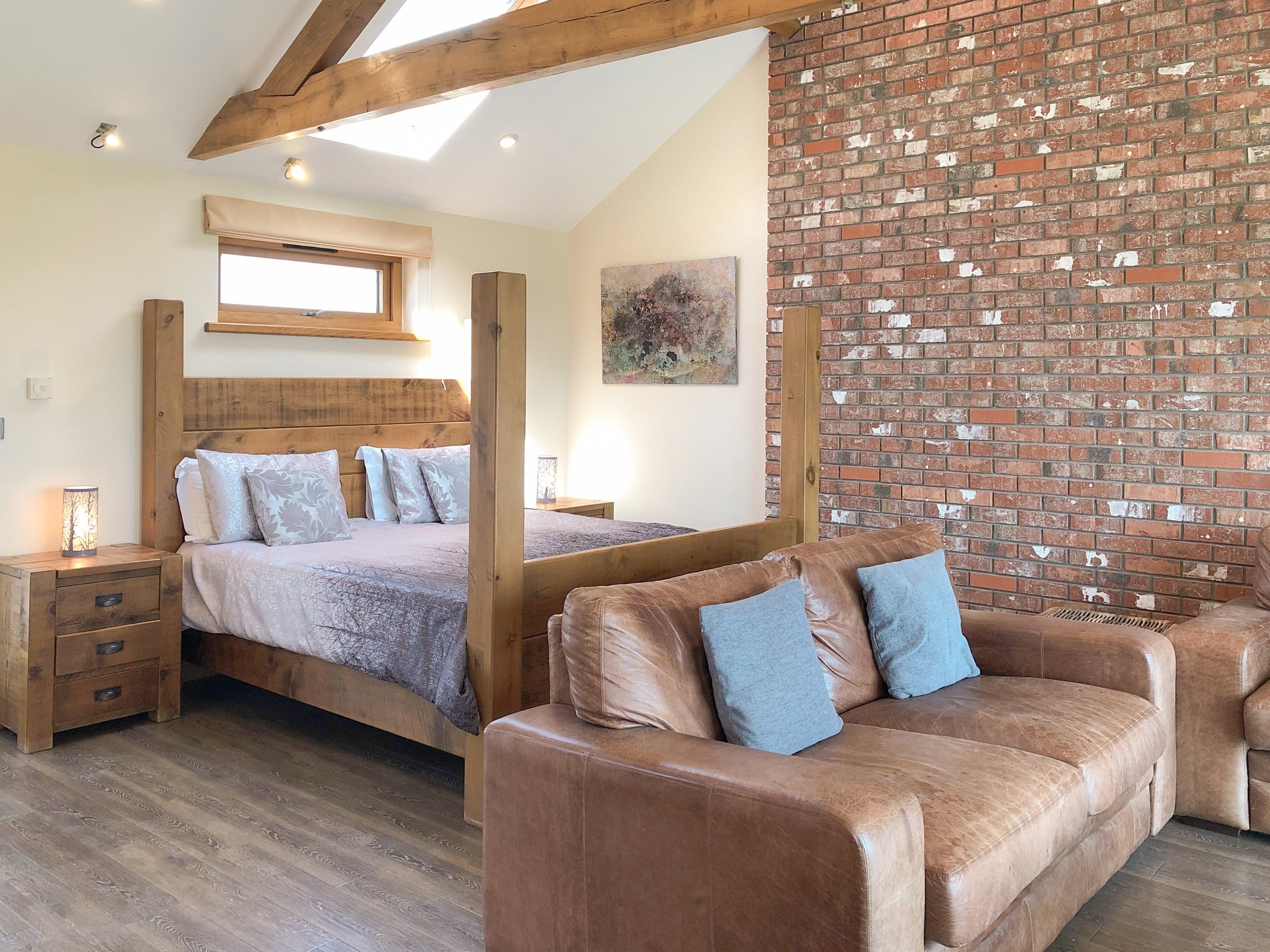 The open plan apartment has a super king-size, memory foam, four poster bed hand crafted from slow-growing Canadian Pine finished with Beeswax which shows off the texture and grain.