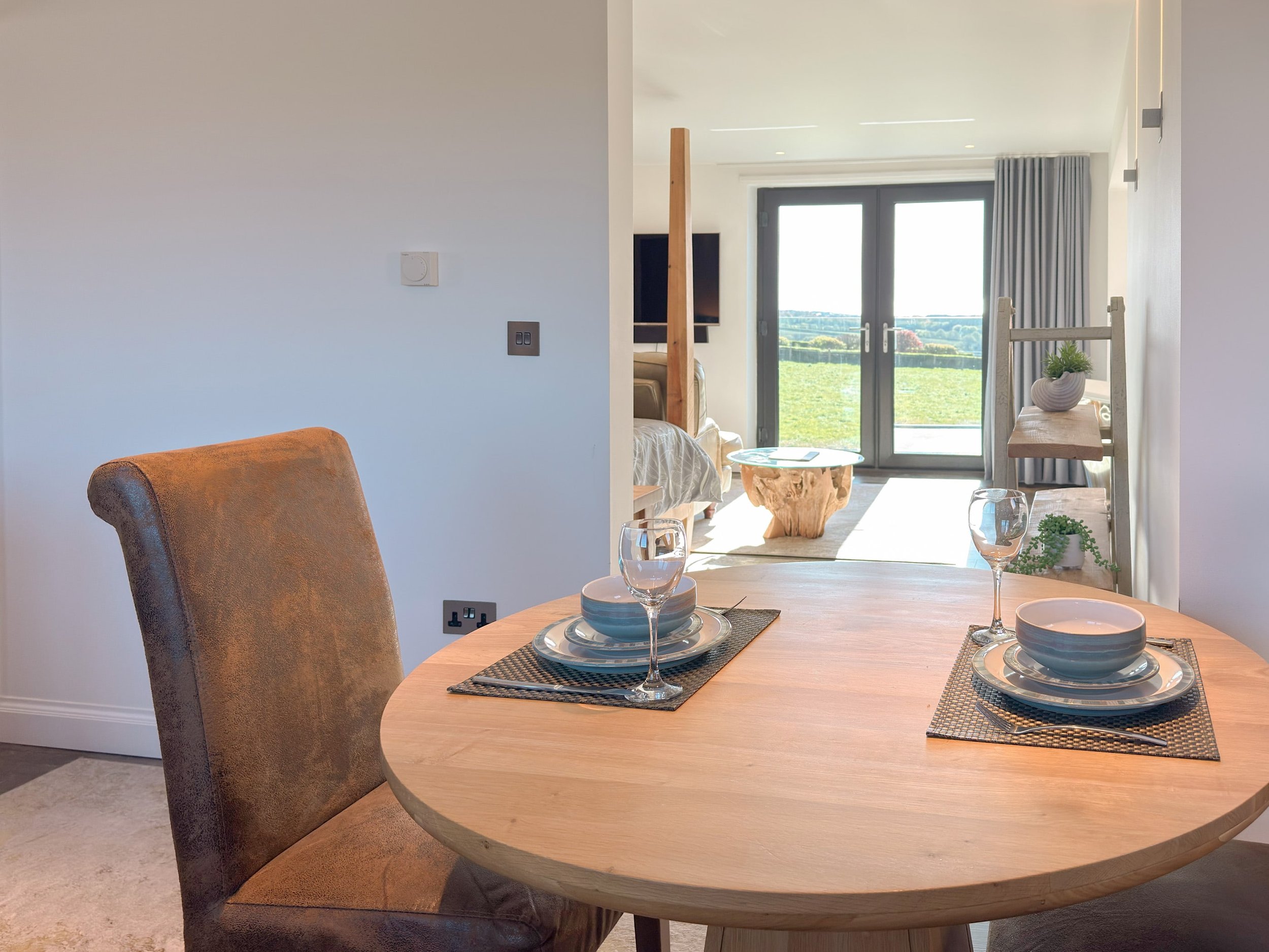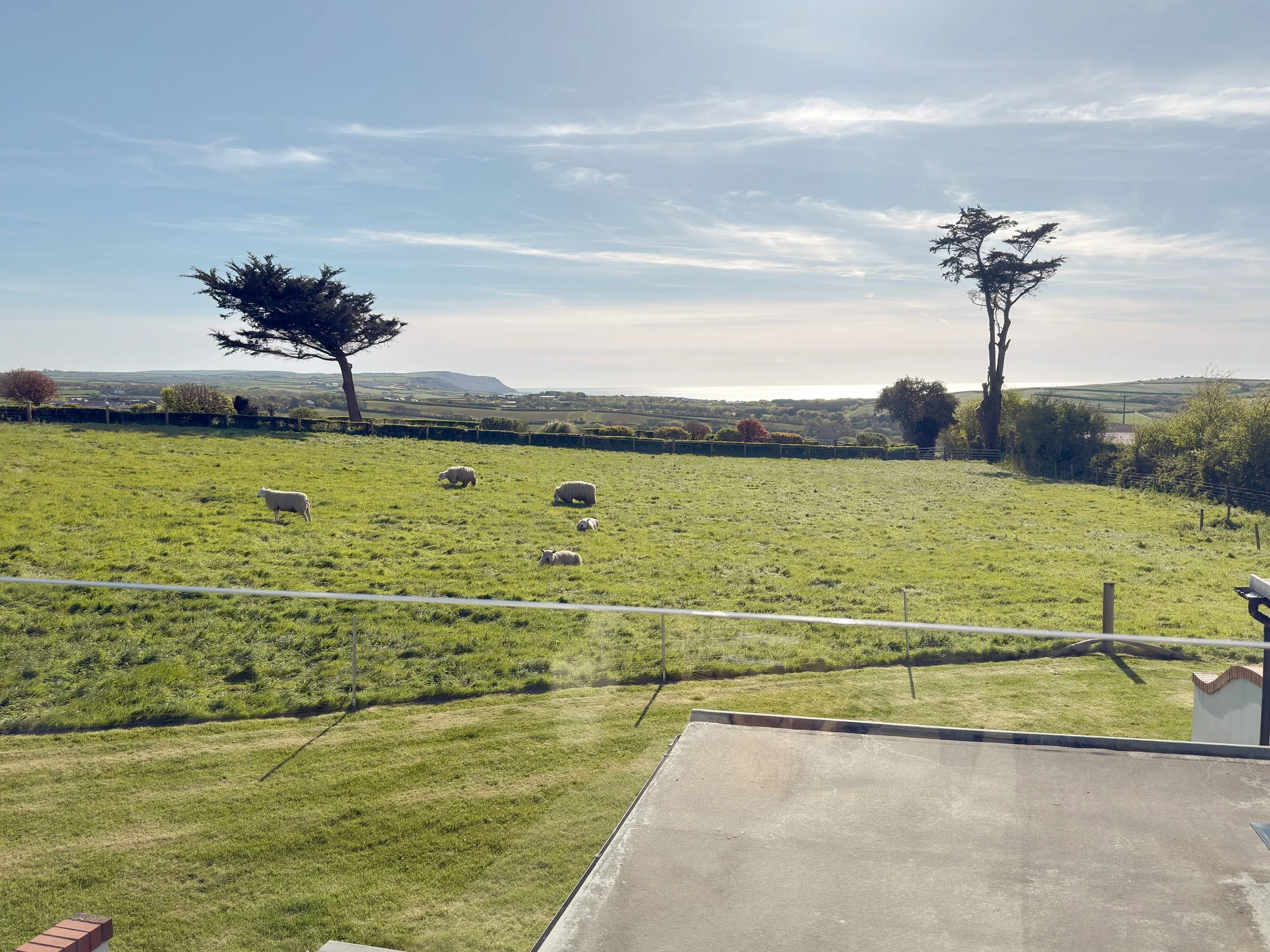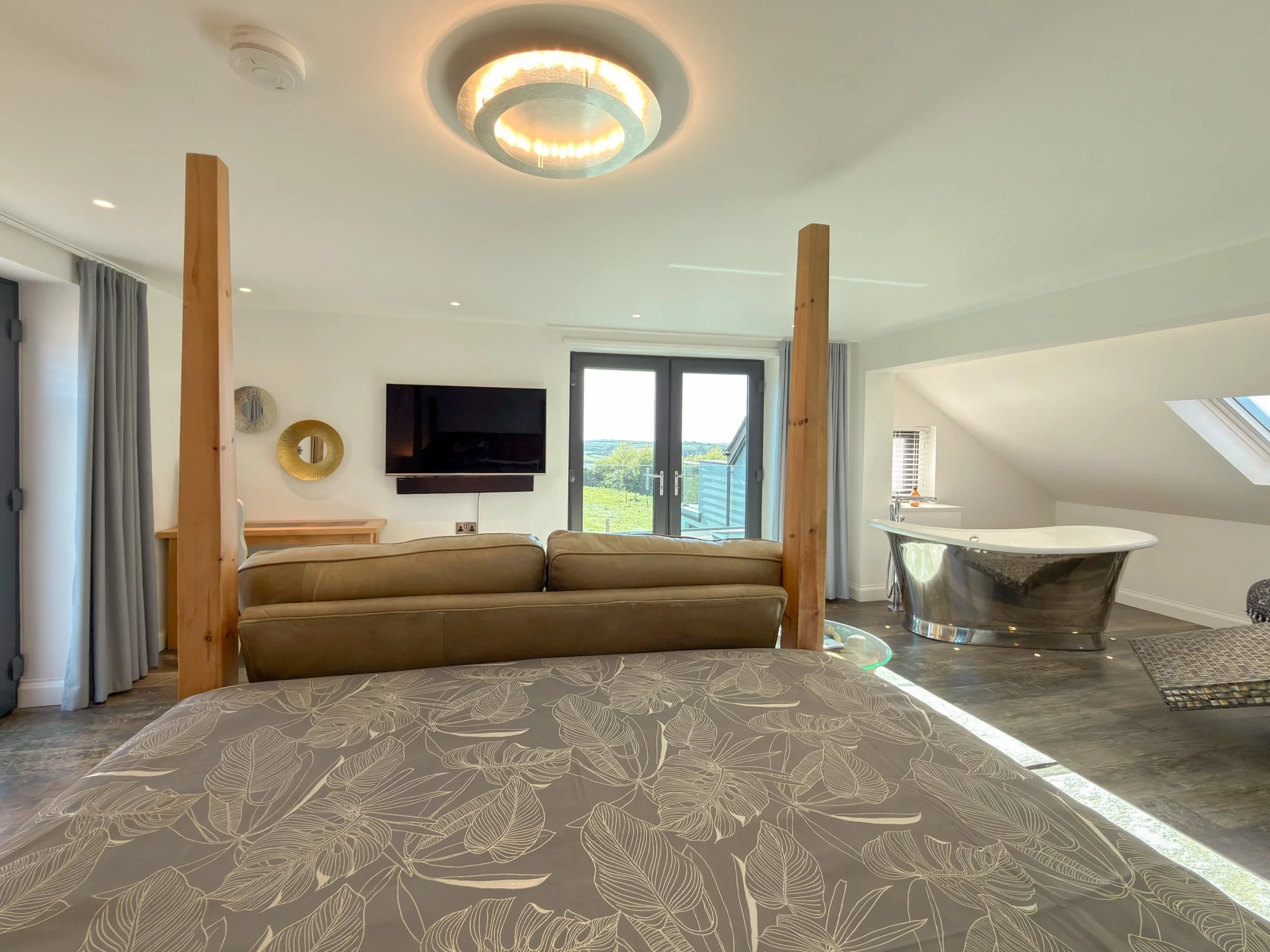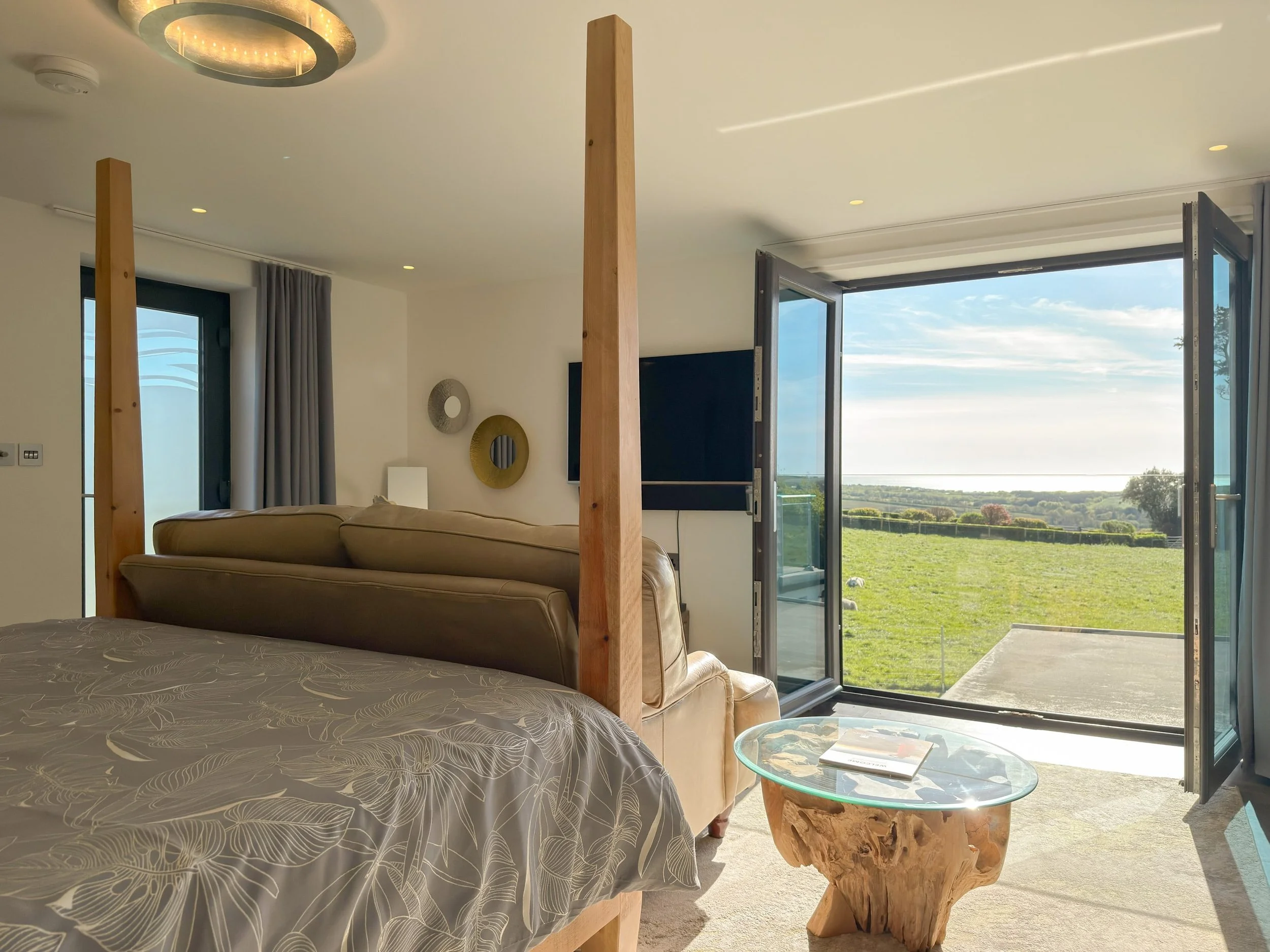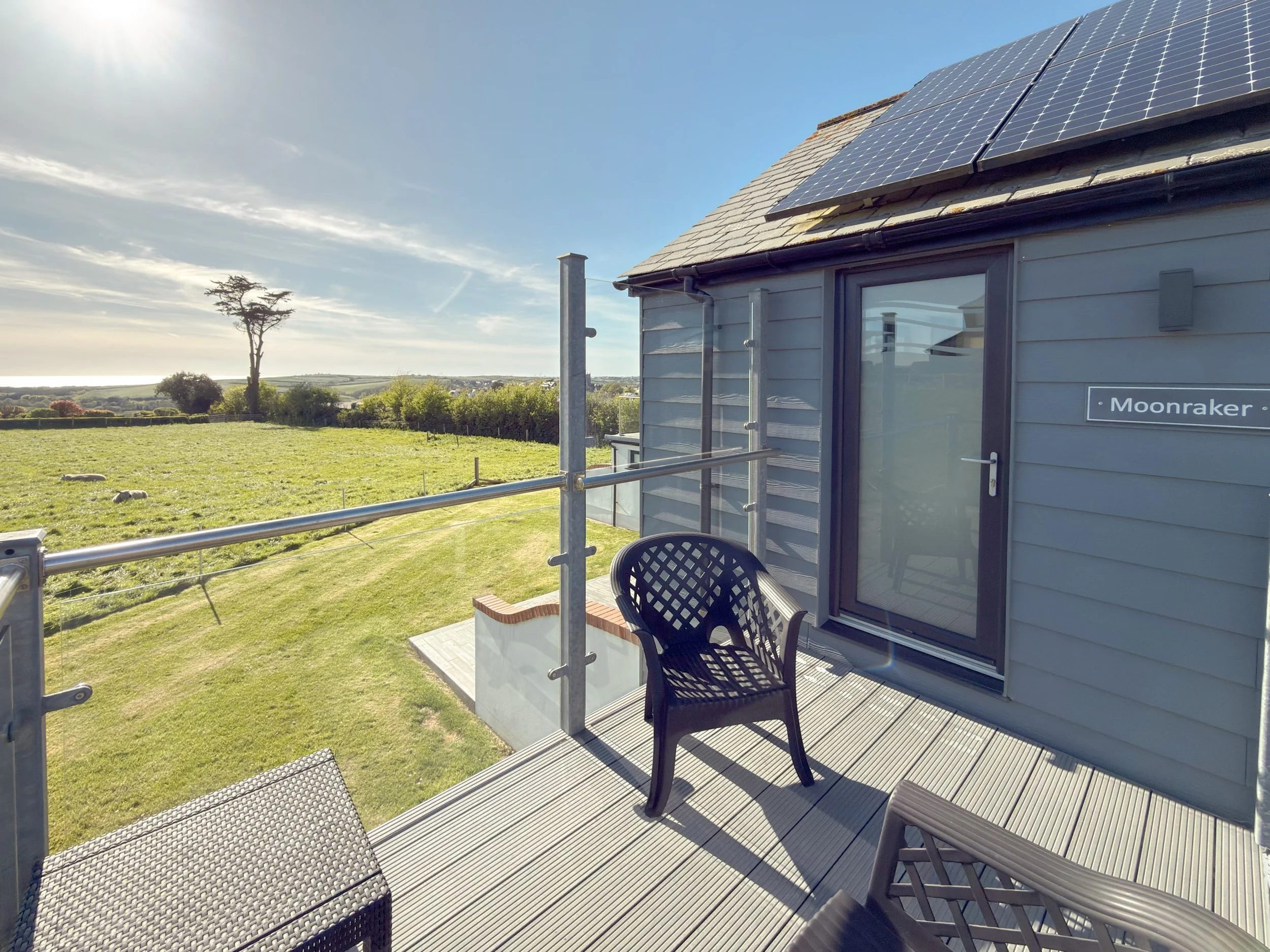 Spectacular countryside and sea views towards Widemouth Bay from the Juliette balcony. First-floor apartment features an air-spa copper bath and heated lounger.