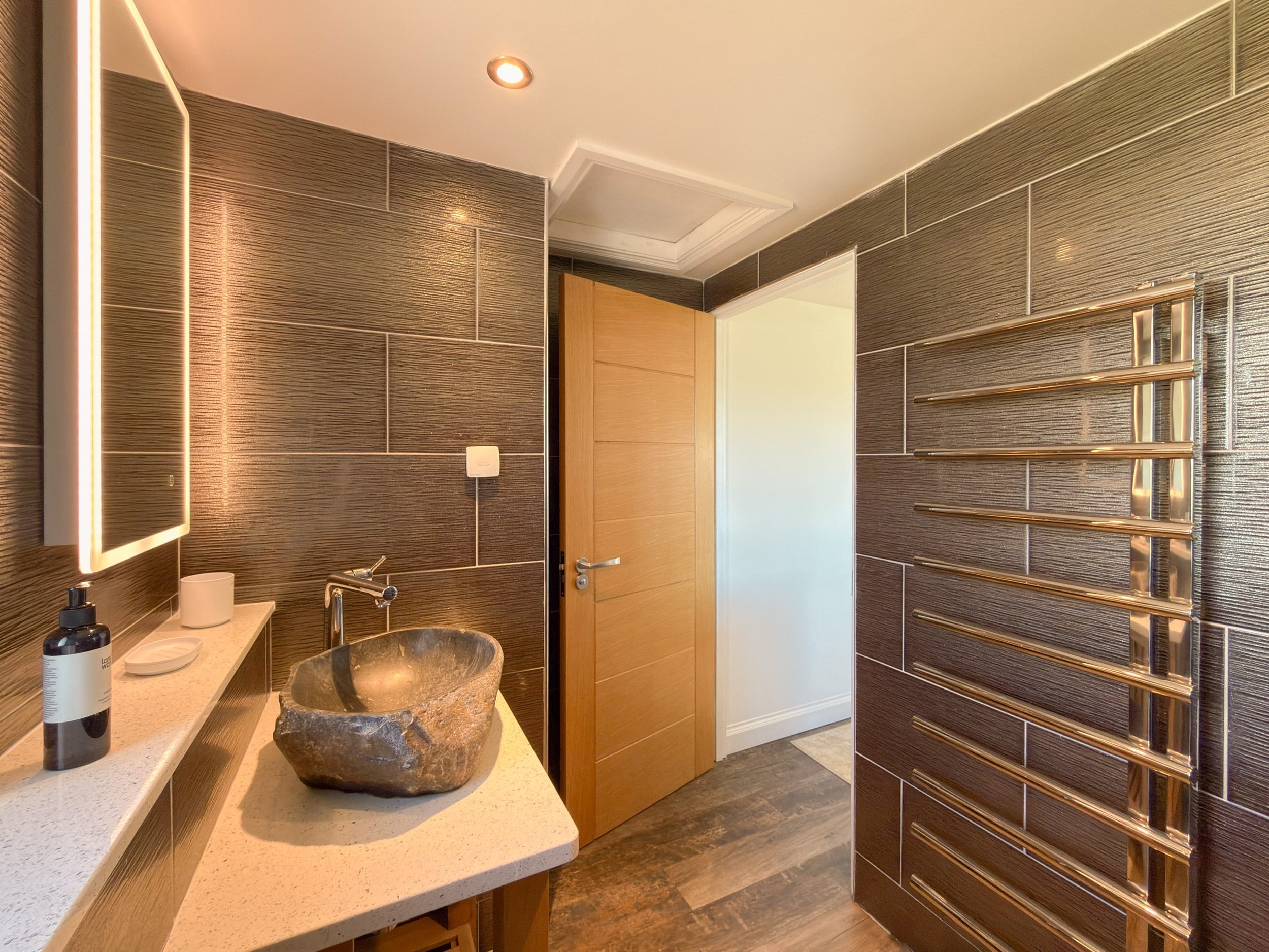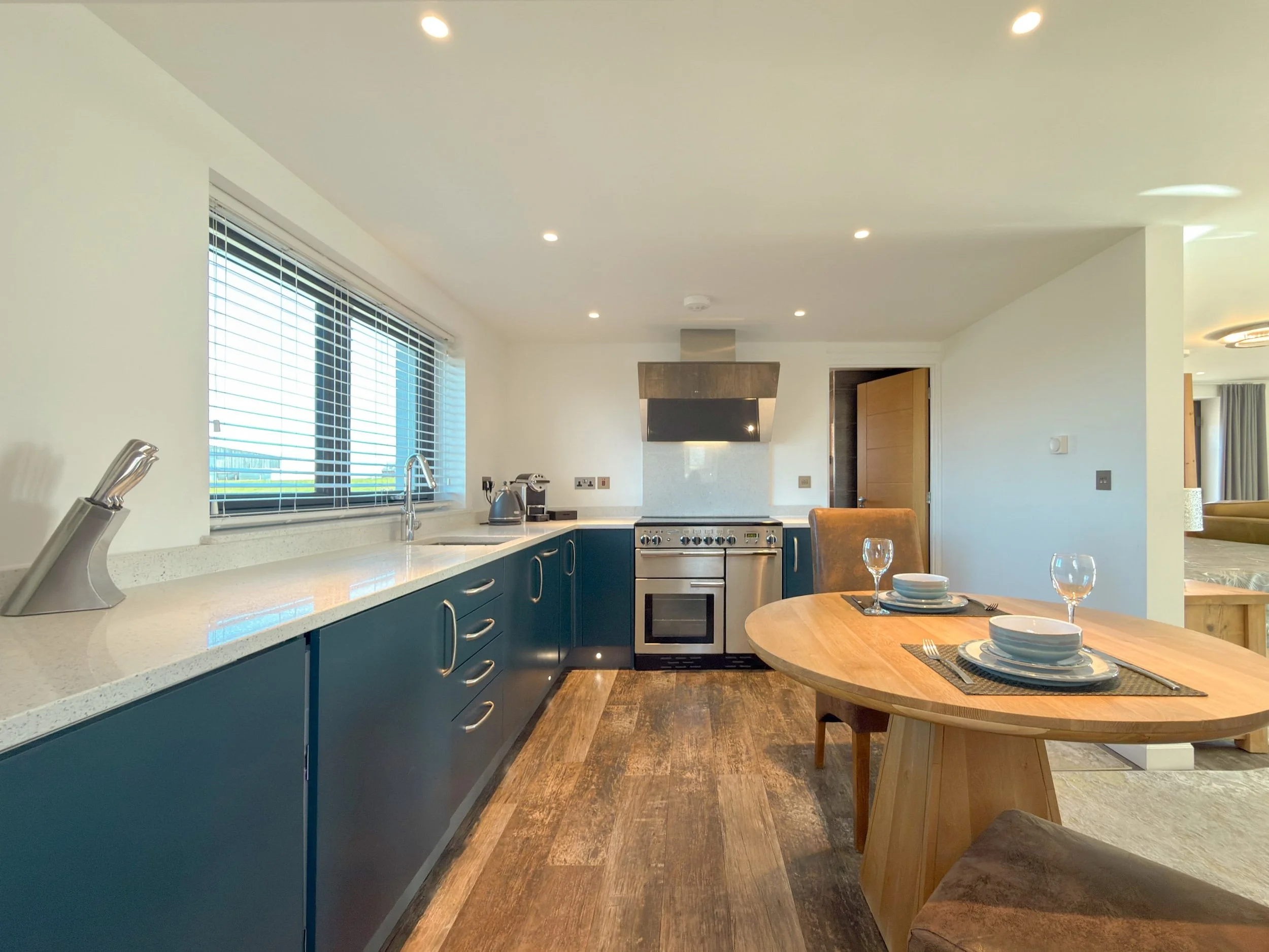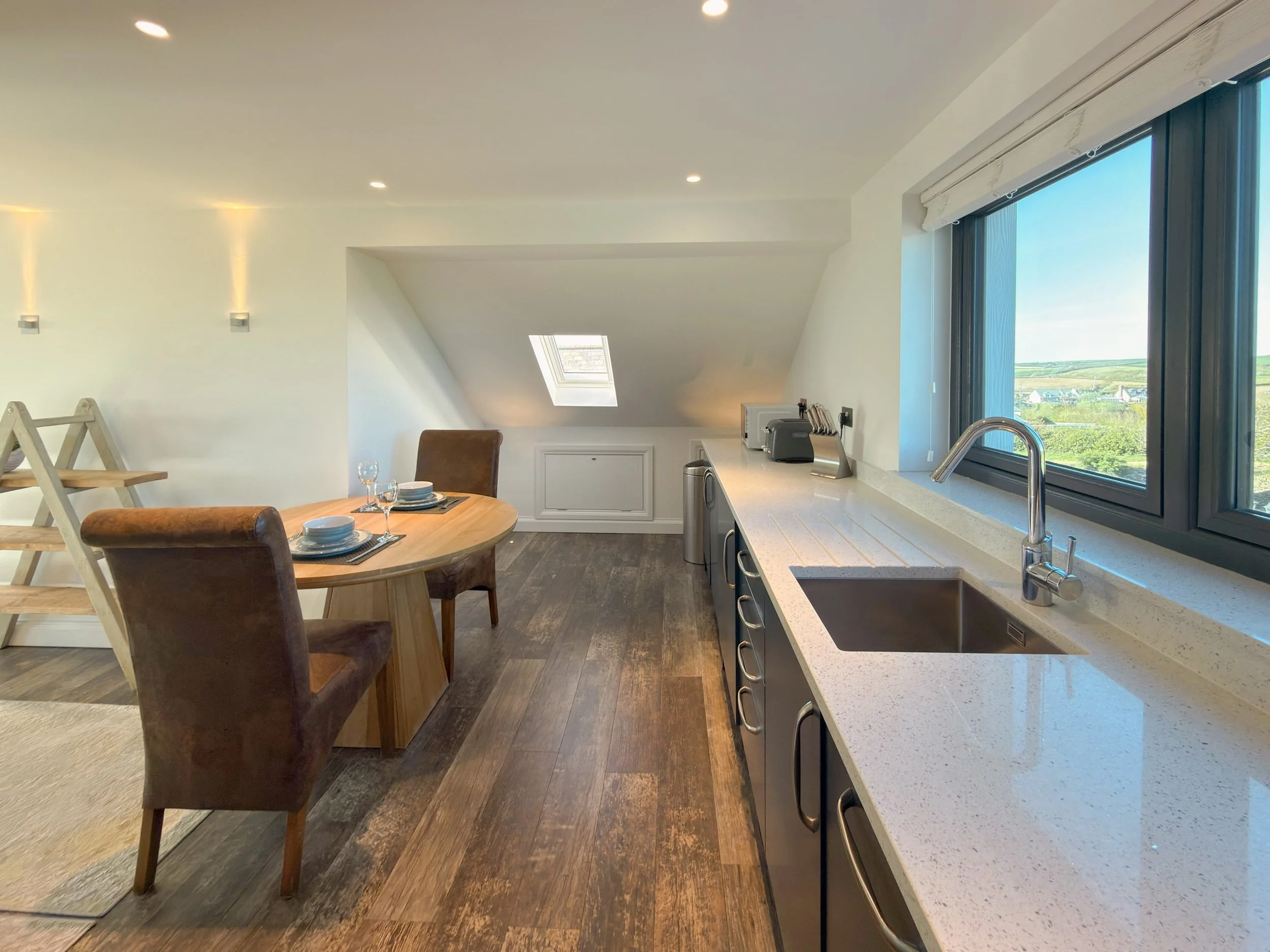 The first-floor Moonraker apartment has a contemporary feel and the sitting area has a cosy sofa. Laze on the heated lounger and admire the spectacular shimmering sea towards Widemouth Bay.