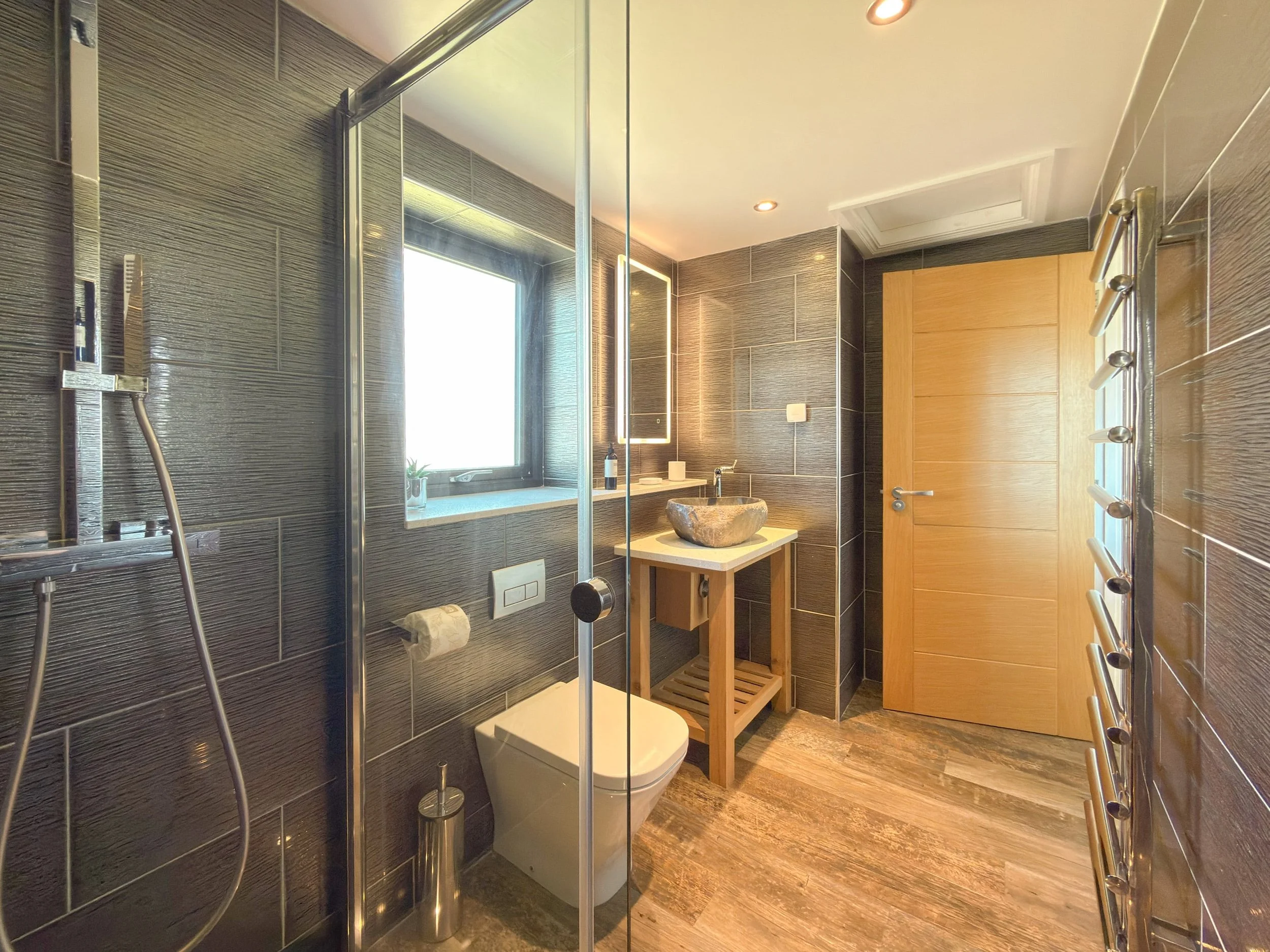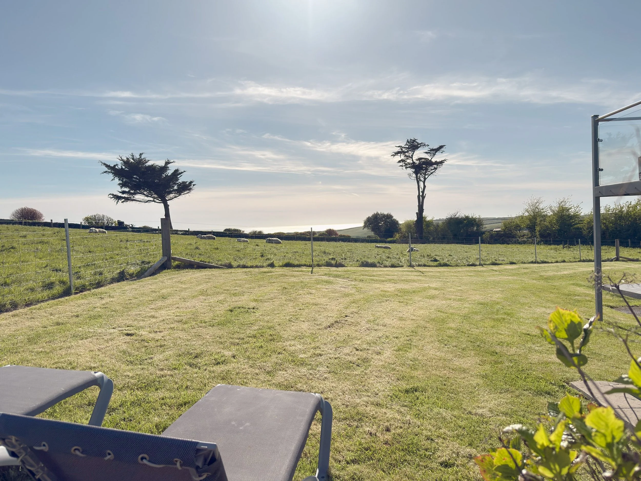 There is a small entrance balcony area with countryside and sea views, perfect for a morning coffee while the sun rises or make use of the sun loungers on the grass area beside the entrance steps.