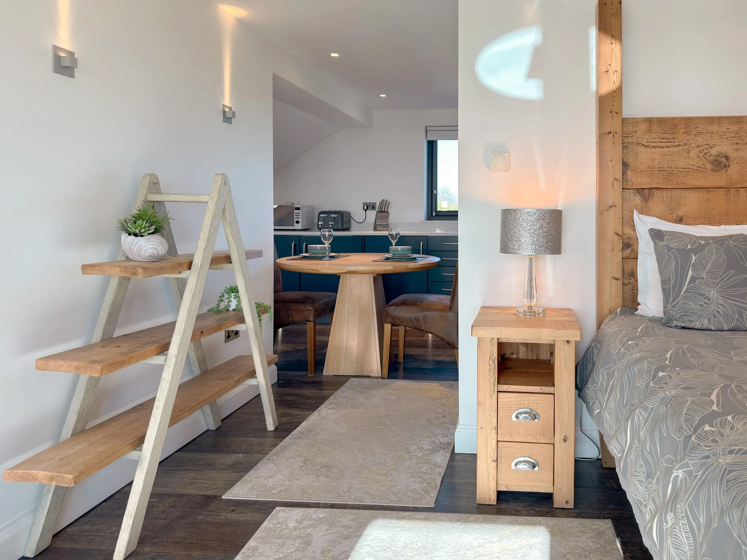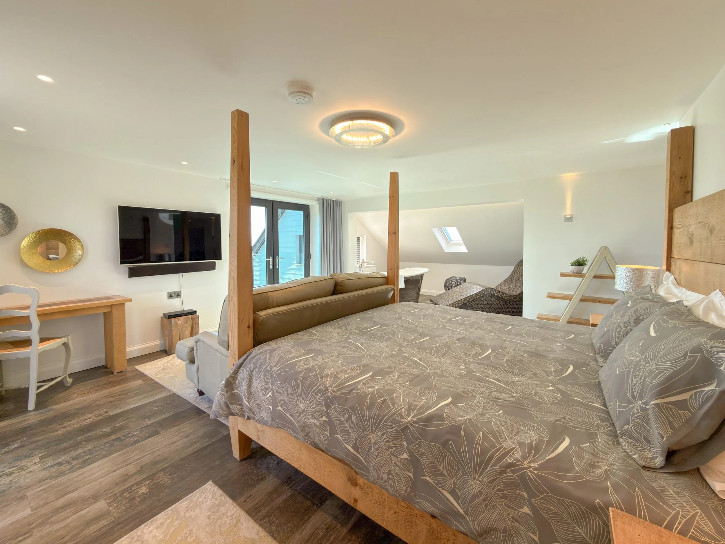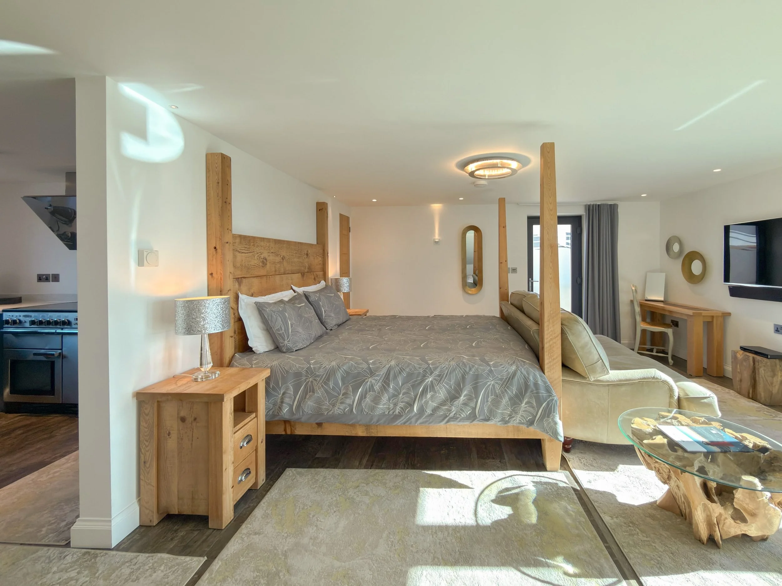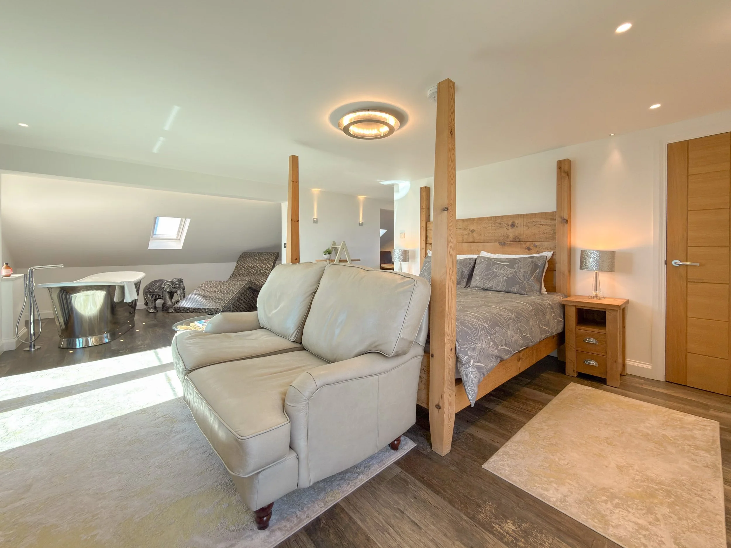 The open plan bedroom has a four-poster super-king size bed with a memory foam mattress.