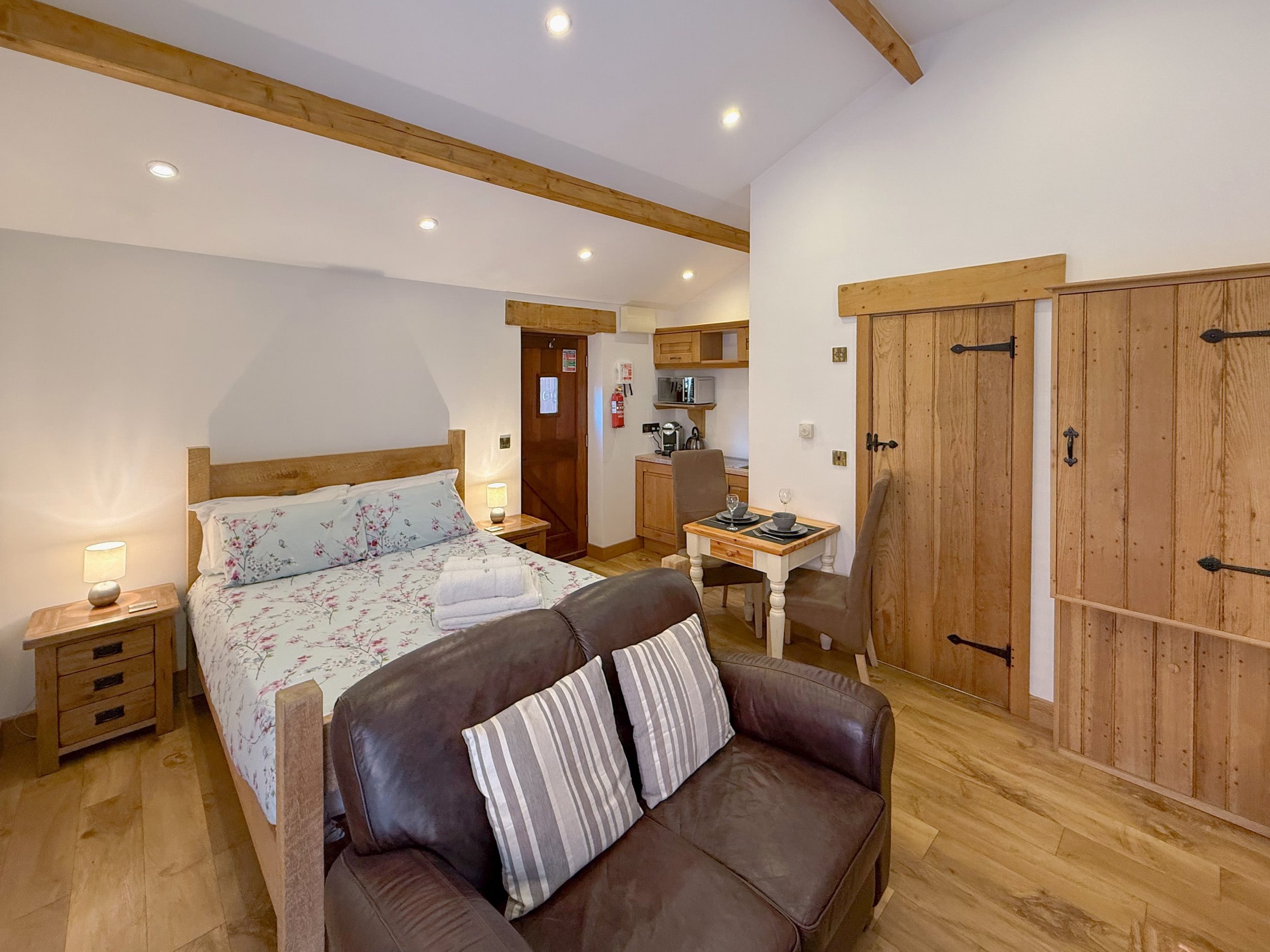 Open plan layout with king-size bed, kitchenette and small shower room. Perfect accommodation for cyclists or walkers near the South West Coast Path.