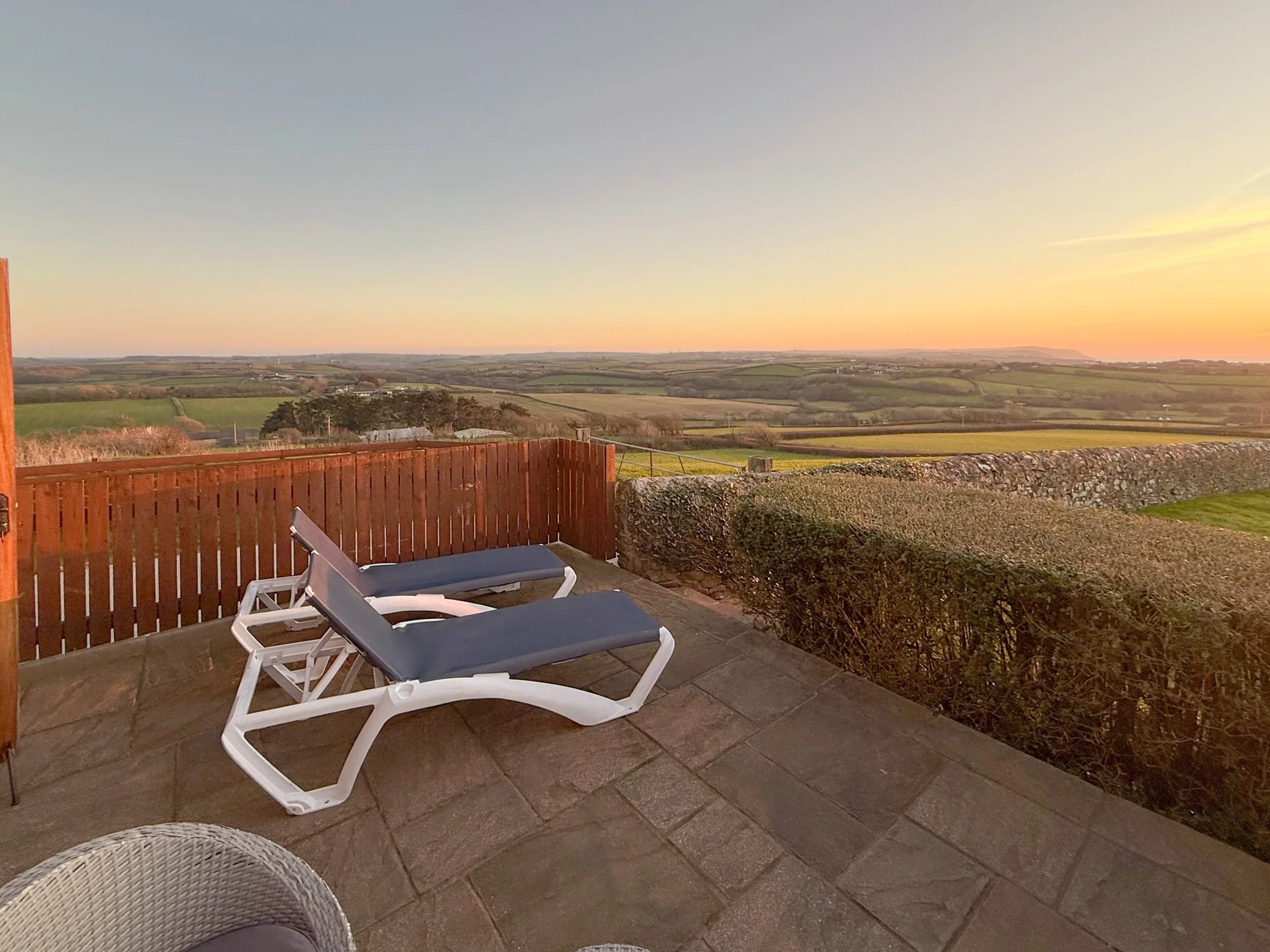 The patio area has outstanding rolling Cornish countryside and sea views. There is access to a larger shared grounds with BBQ area.