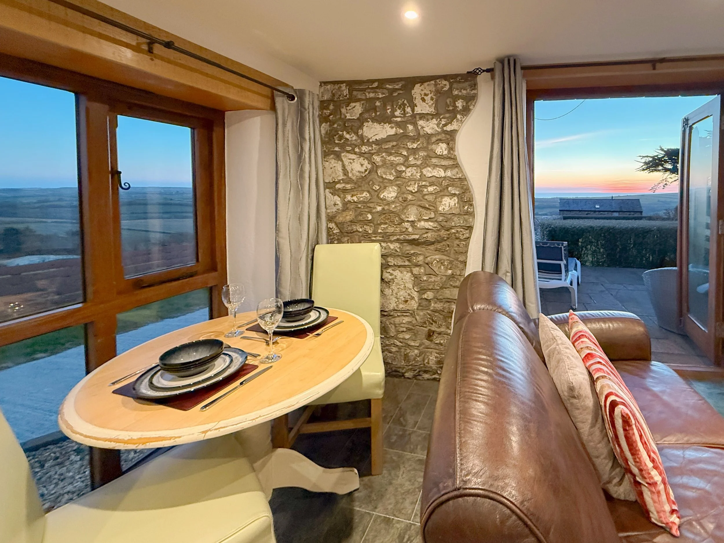The open-plan living and dining area takes advantage of the spectacular south and west facing countryside and sea views.