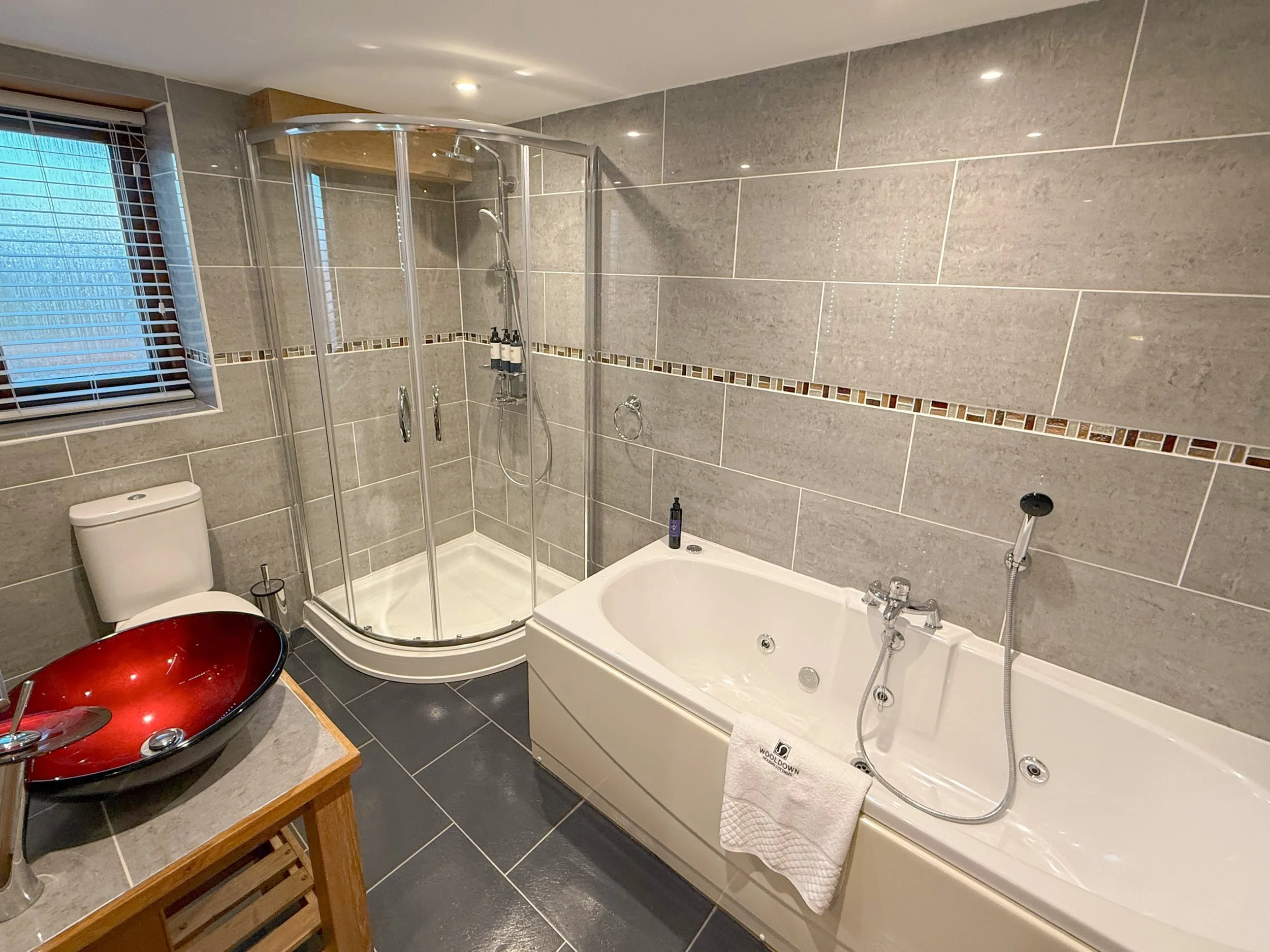 The en-suite bathroom features a spa bath and walk in rainfall shower.