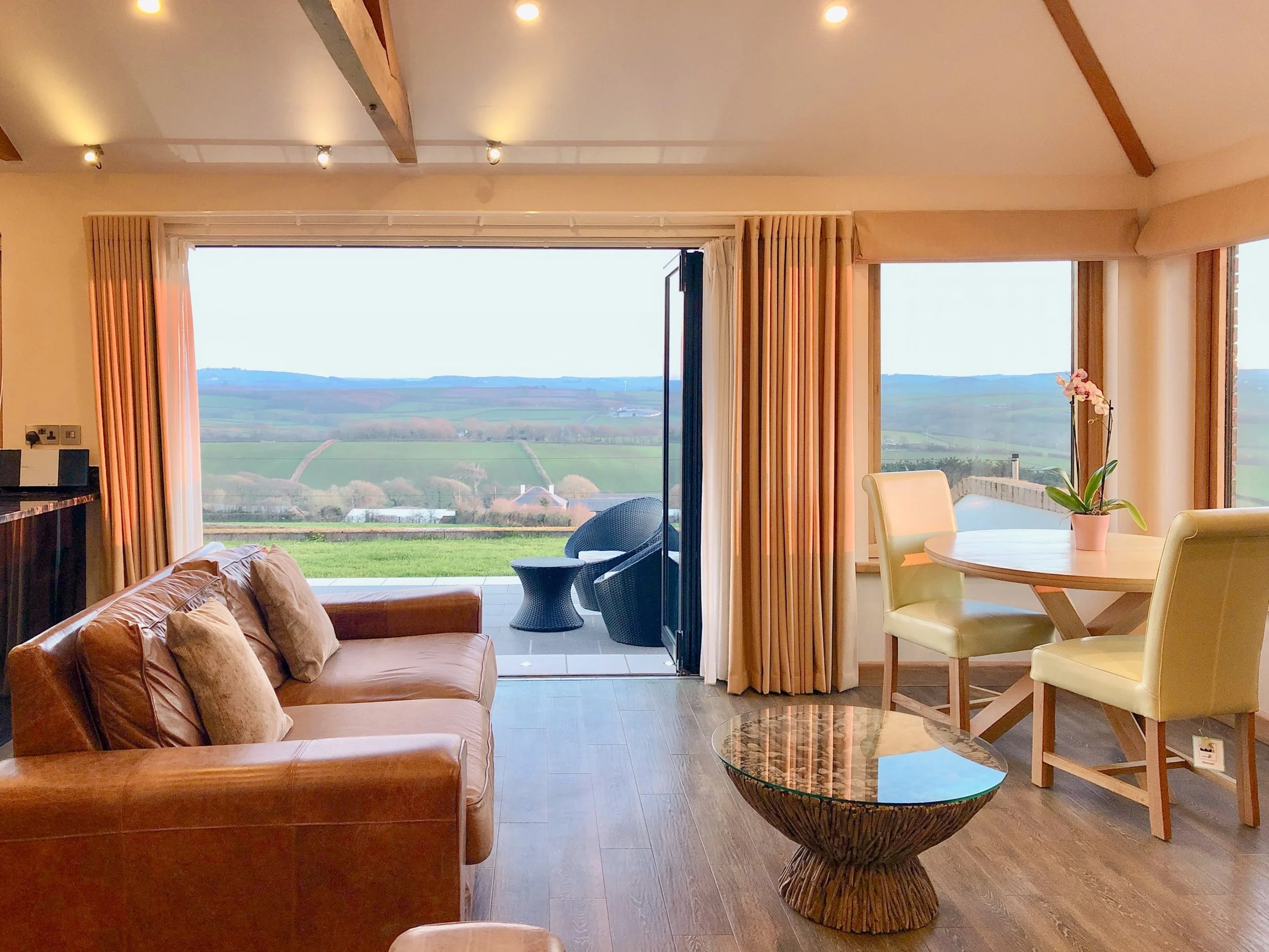 The ultimate romantic escape. Spa bath, super-king size bed and uninterrupted views of the rolling Cornish countryside and towards the sea at Widemouth Bay.