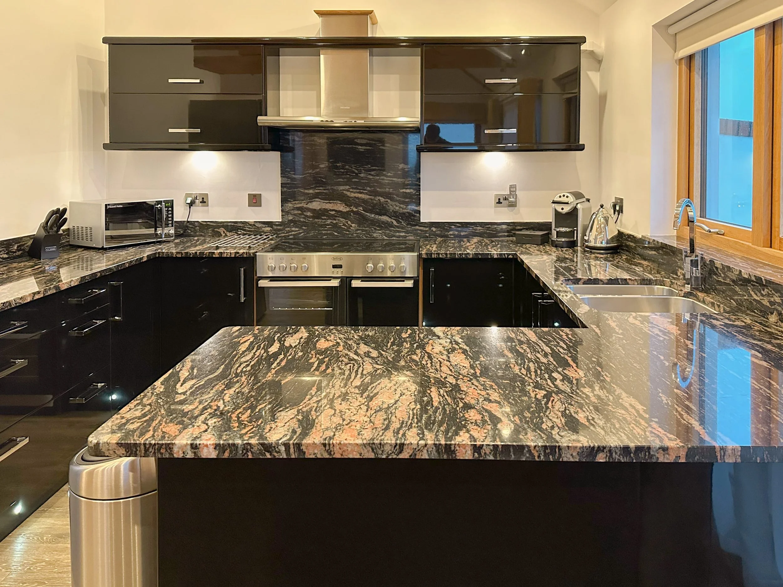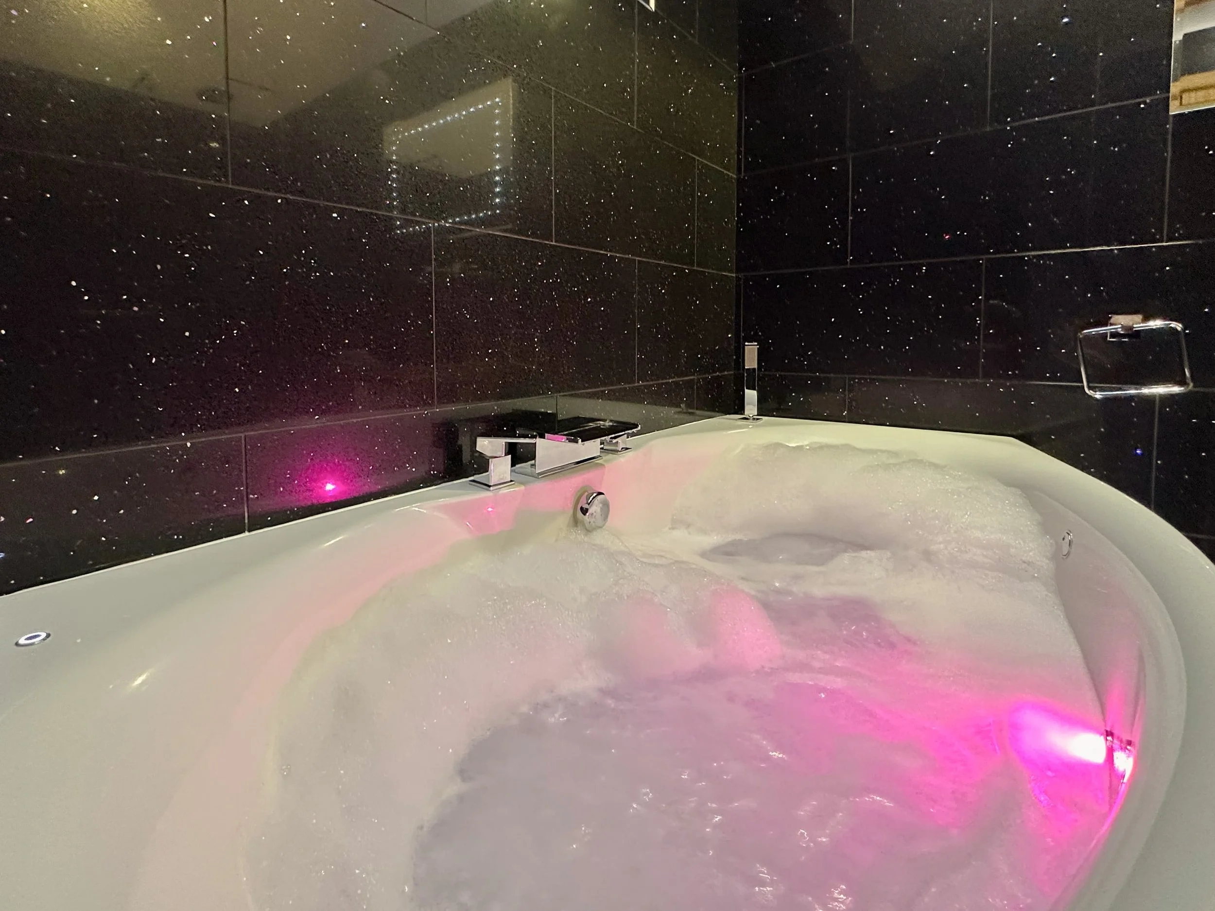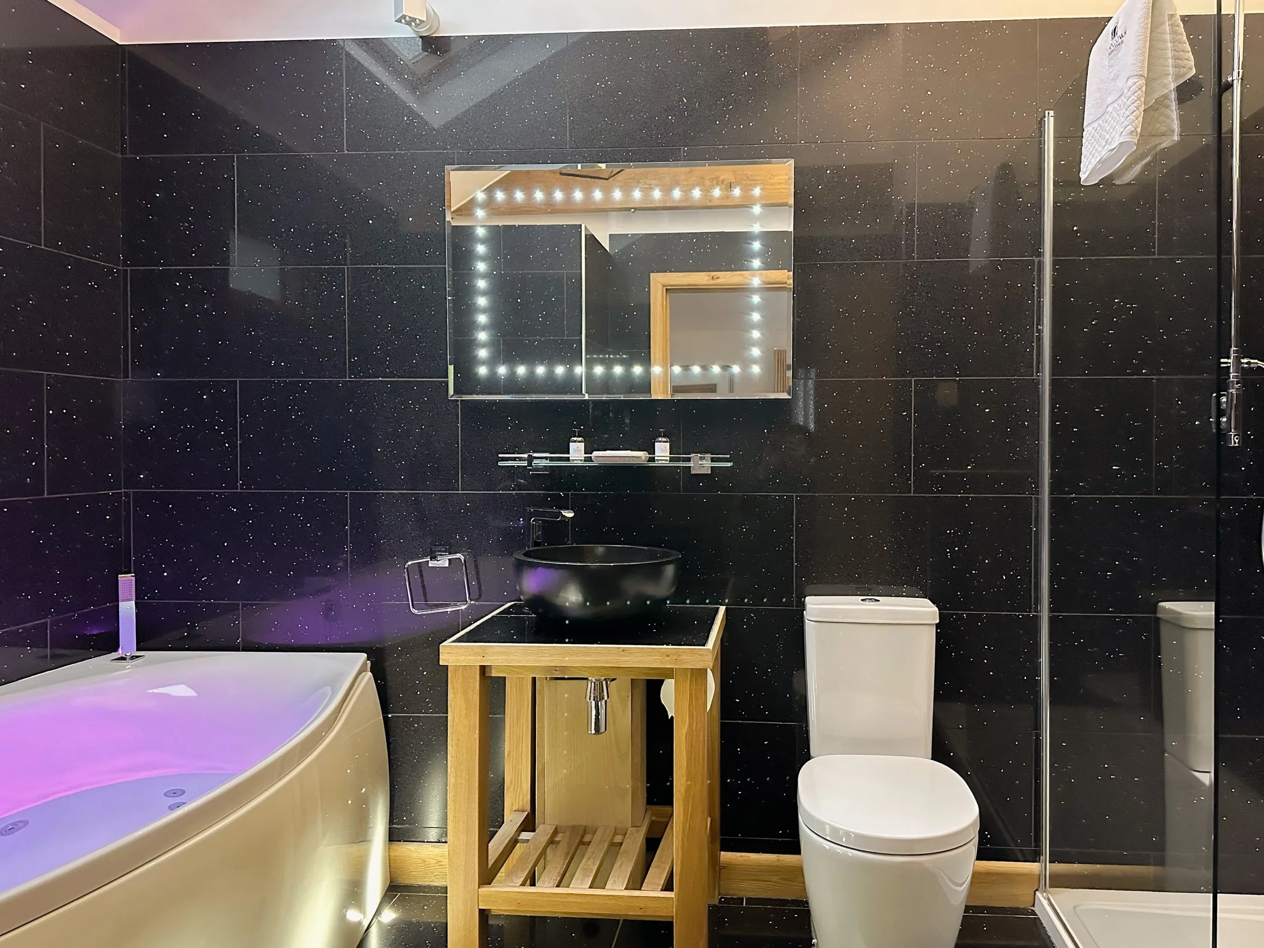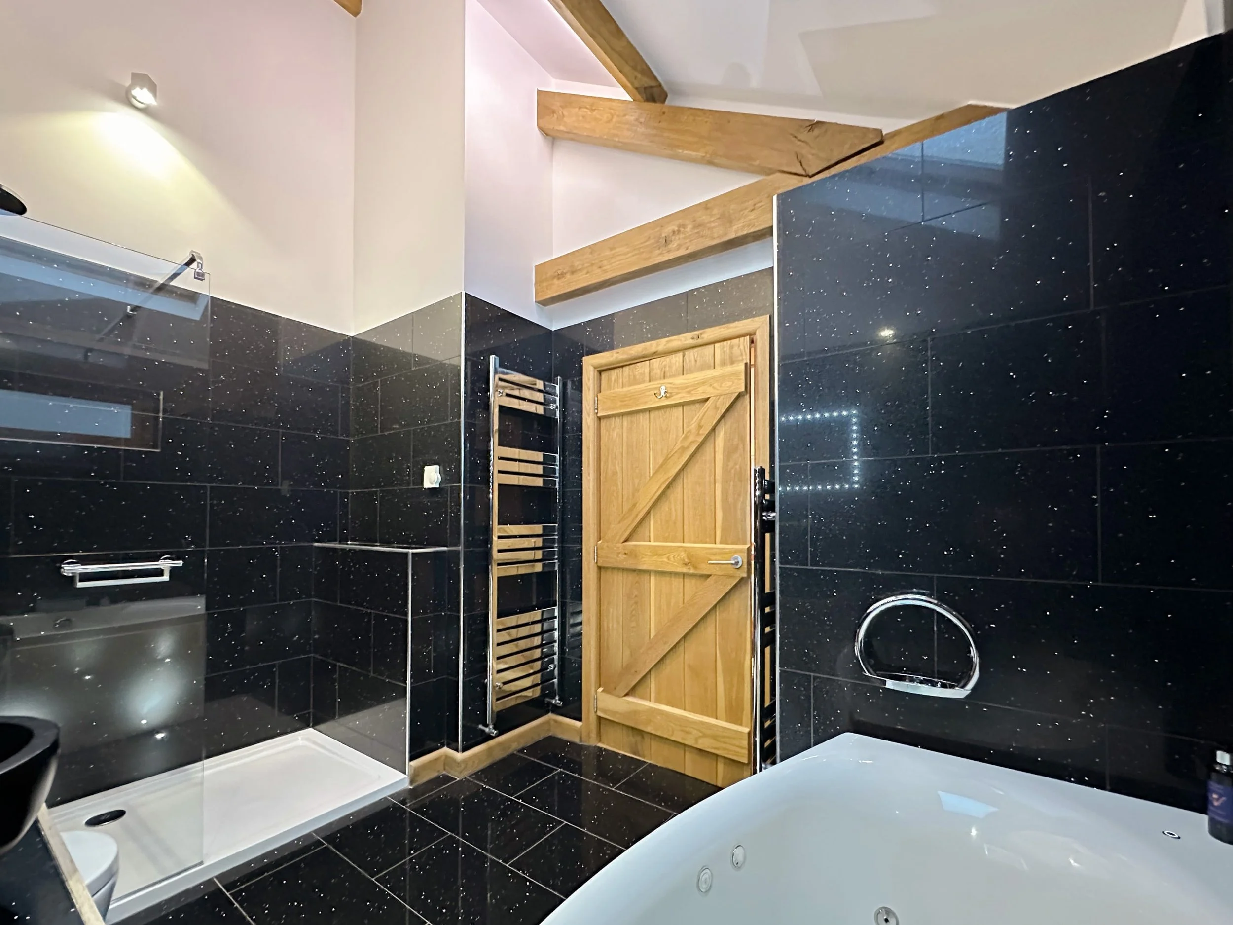 The en-suite bathroom features a spa bath, bold, black sparkling floor and wall tiles and a walk in rainfall shower.