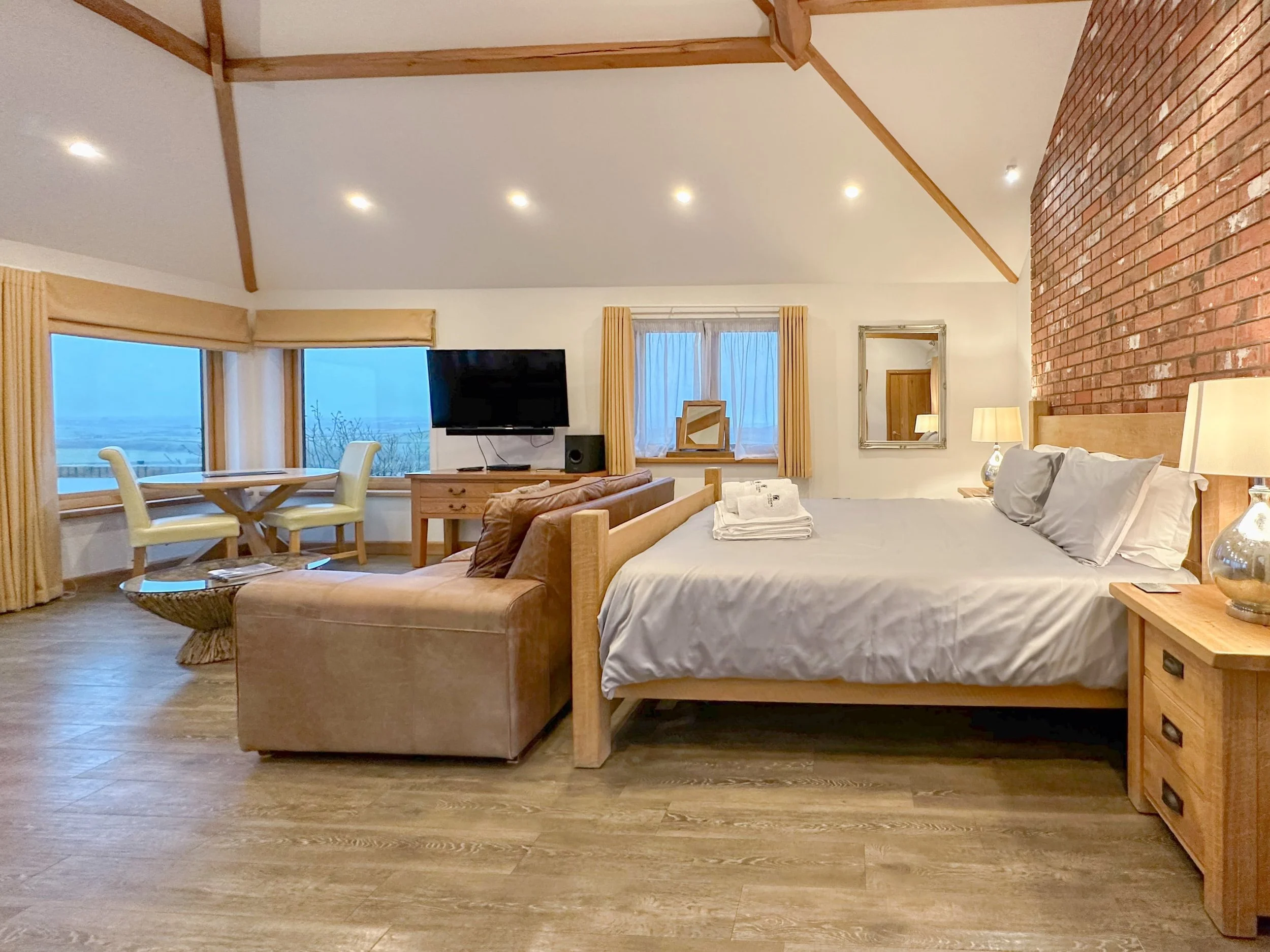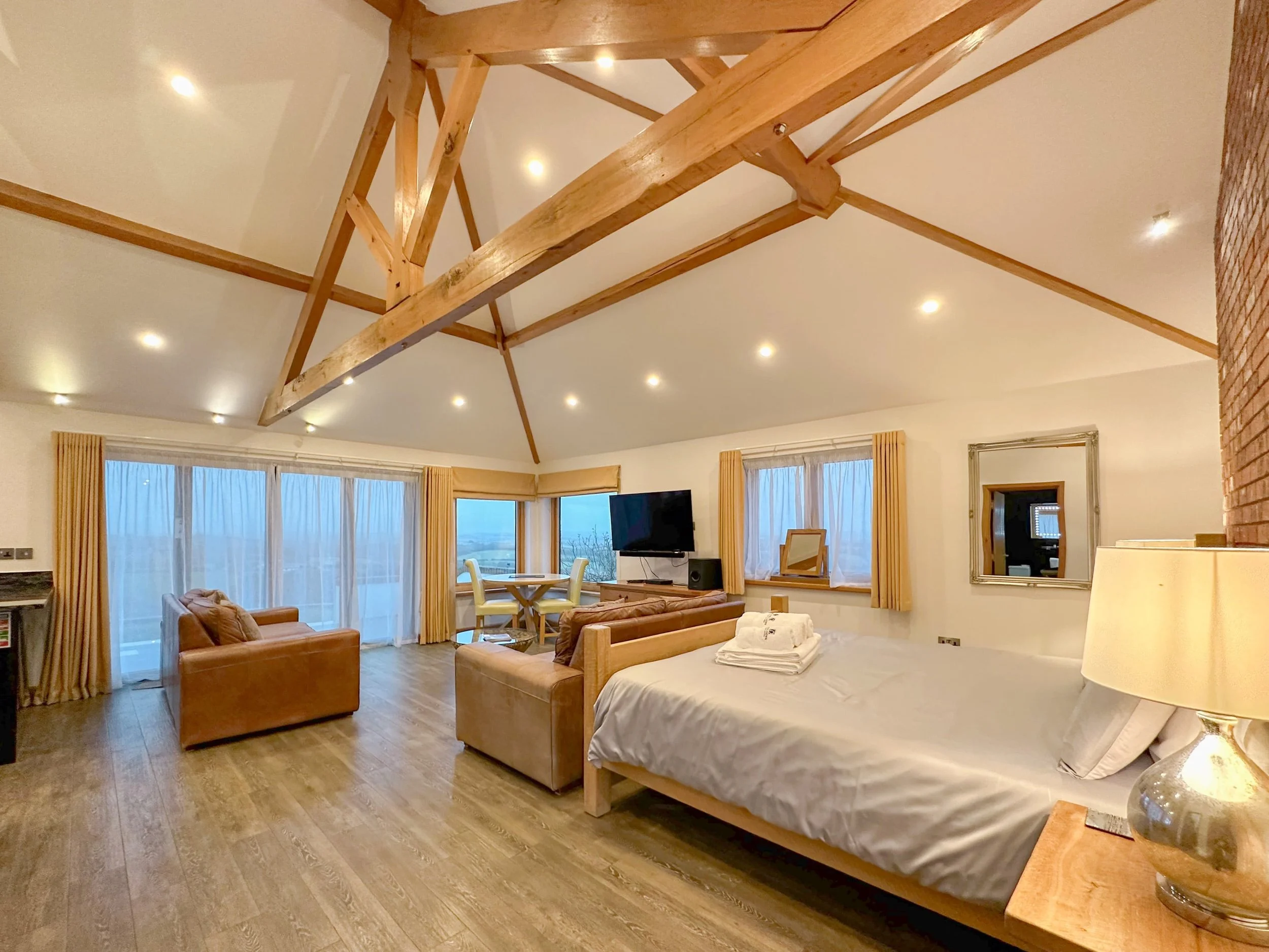 The chunky oak beams, solid oak doors give a traditional twist to this otherwise contemporary space with underfloor heating to compliment the apartment’s quality finish. The large patio bi fold doors open to offer uninterrupted views.