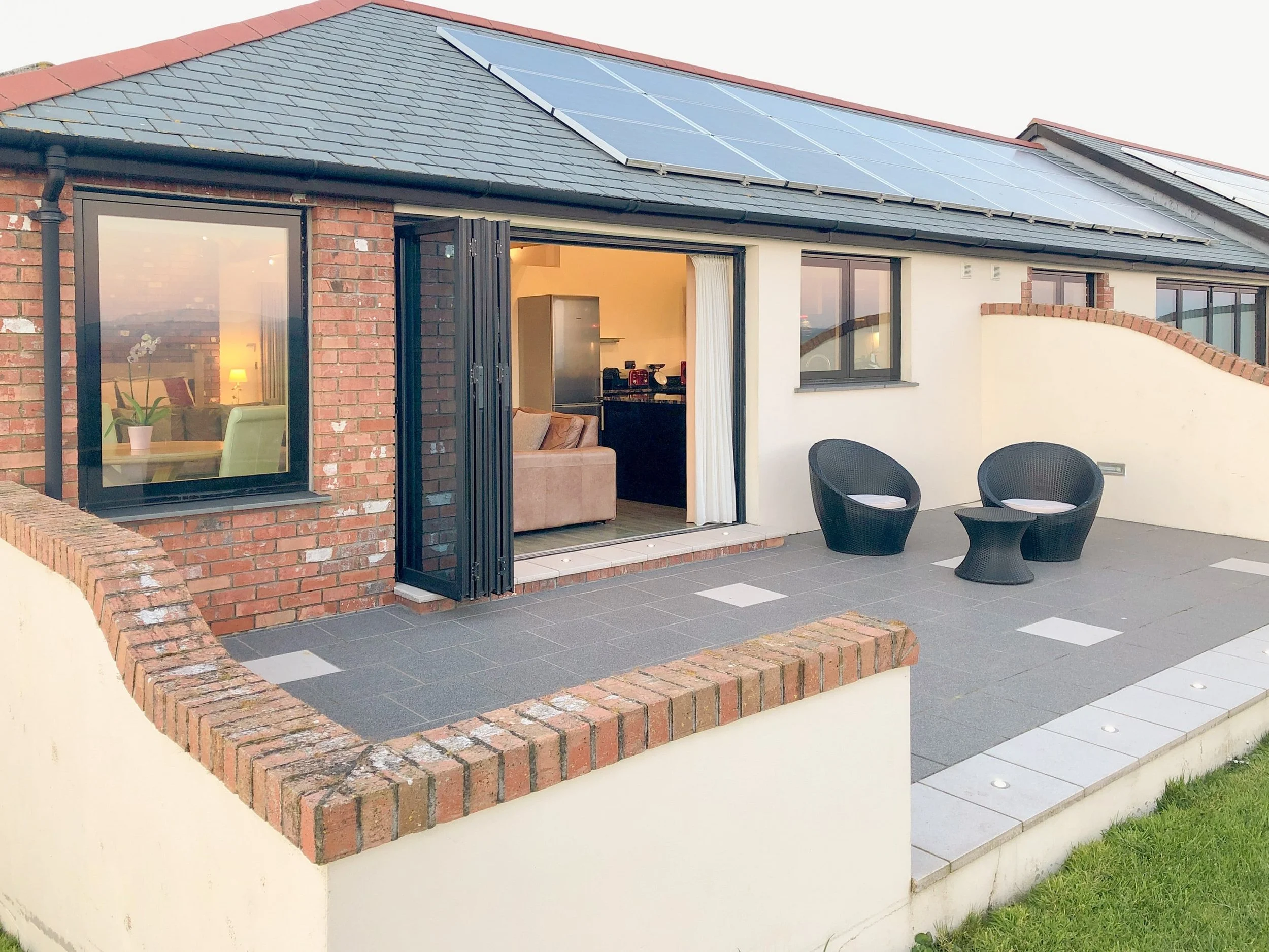 The bi folding doors open to the patio area with outstanding rolling Cornish countryside and sea views. Parking is a short distance from the apartment.