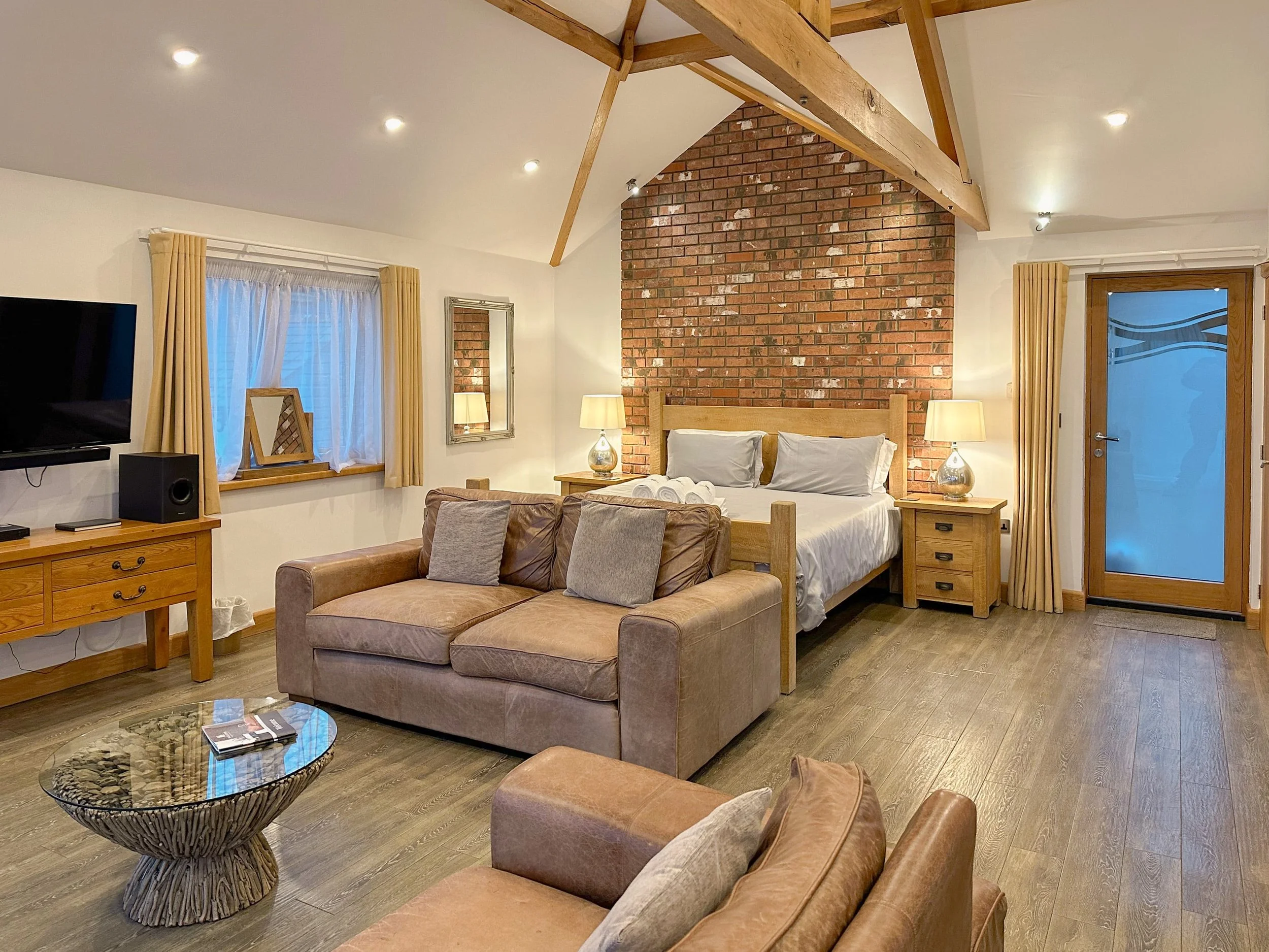 The open plan apartment has a super king-size bed is hand finished with Beeswax which shows off the distinct wartime Ripsaw marks, sourced from a sawmill on the Baltic Coast. Teamed with a memory foam mattress.