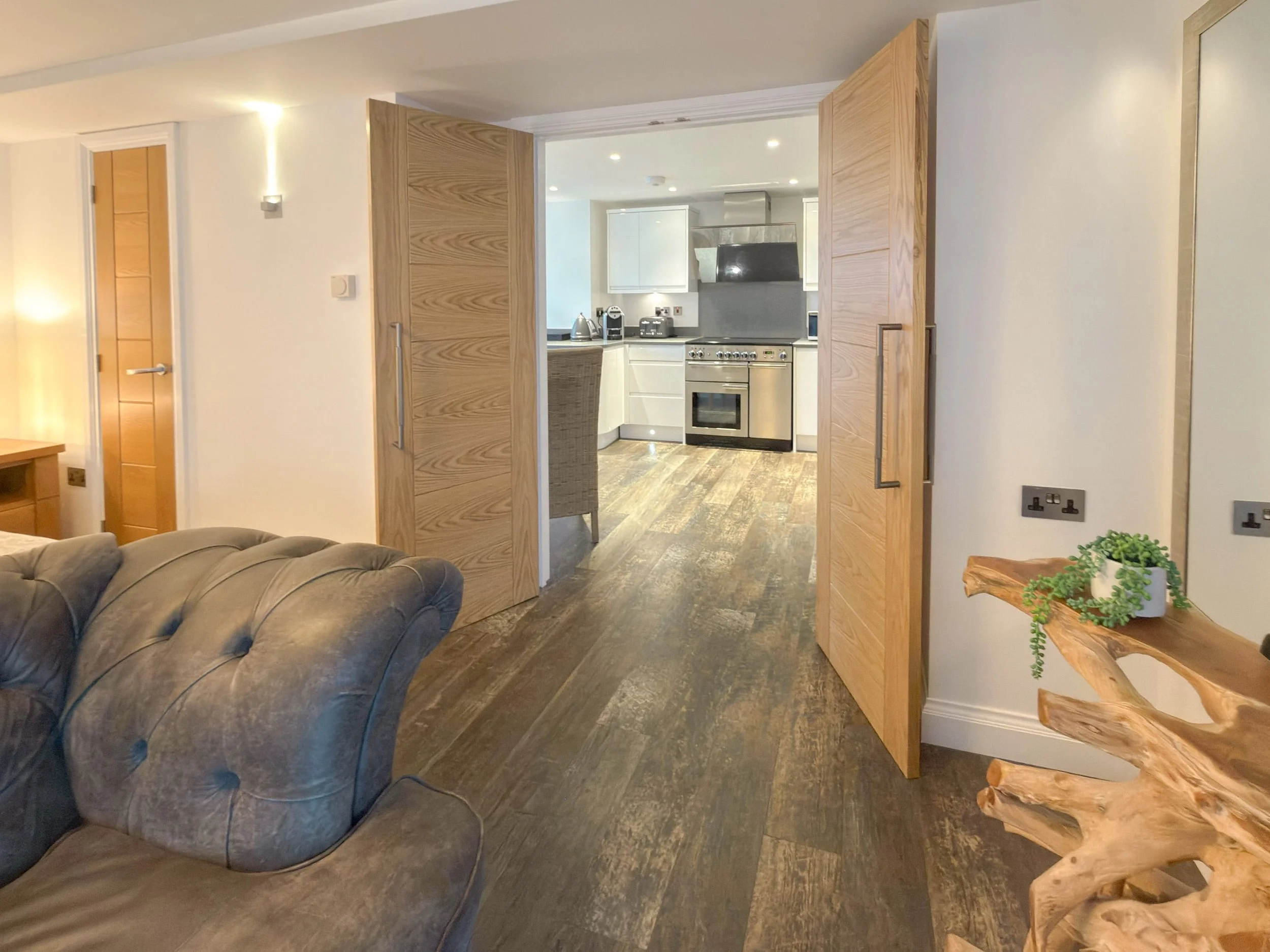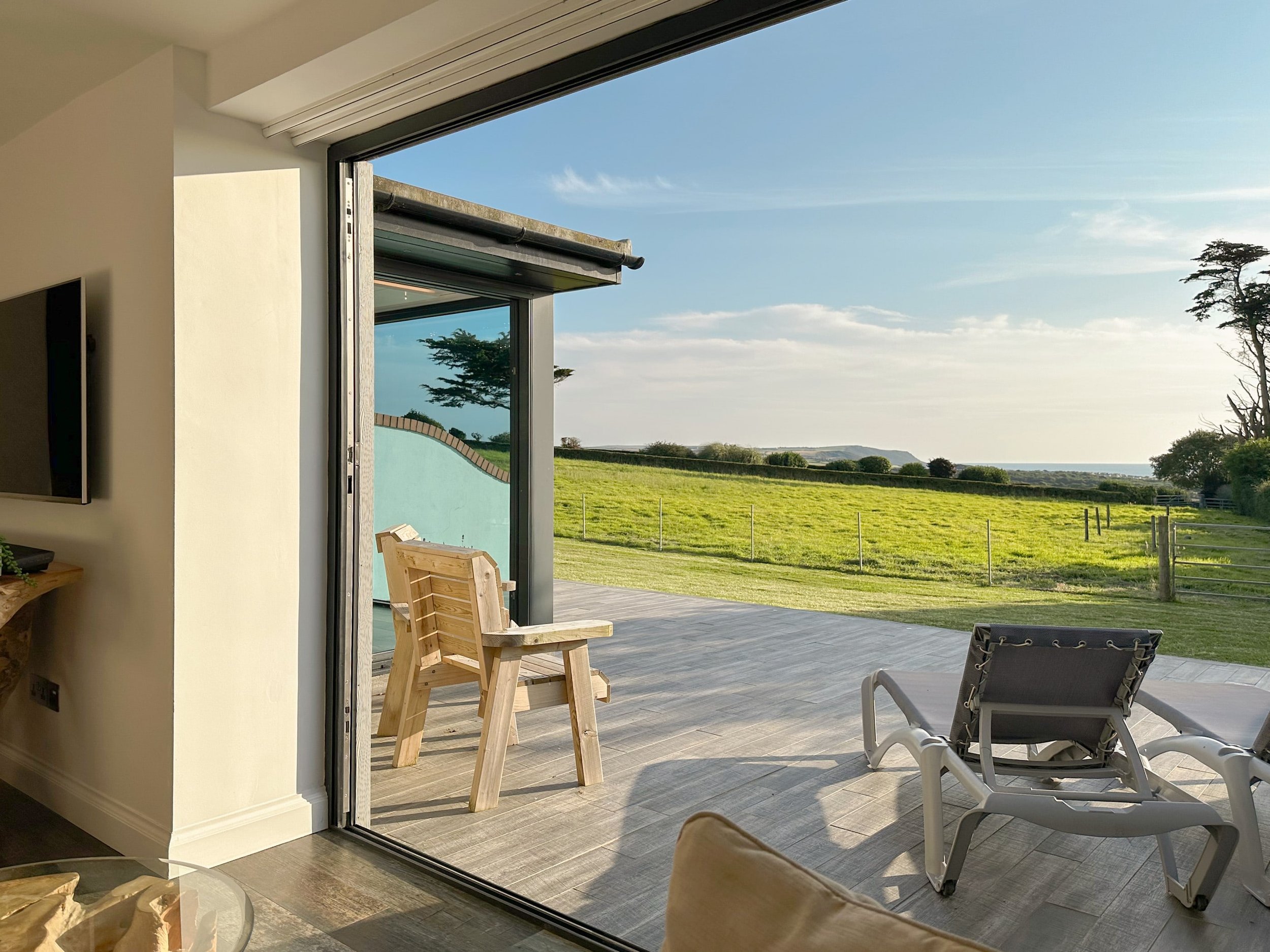 The bi-fold doors open to the patio area with countryside and sea views towards Widemouth Bay and the town of Bude.